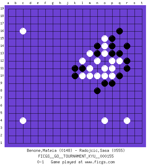 Last move : 0-1 2014 May 15 9:21:41 [Event "FICGS__GO__TOURNAMENT_KYU__000155"] [Site "FICGS"] [Date "2014.03.12"] [Round "1"] [Black "Benone,Mateia"] [White "Radojcic,Sasa"] [Result "0-1"] [Rating 1 "0148"] [Rating 2 "0555"] 1.q16 c16 2.r14 r4 3.p13 c4 4.o12 q12 5.r11 p11 6.q10 p10 7.p9 o10 8.o9 n10 9.n8 o4 10.n11 m10 11.l11 l10 12.k10 p12 13.q13 o13 14.n13 o14 15.p14 o15 16.p15 m11 17.m12 l12 18.k11 m13 19.n14 n12 20.r12 o11 0-1 This go game has been lost on time (started : 2014.03.12 20:59:2) Here are the names of the openings (joseki) played in the four corners : Corner q4 : r4 p9 Komoku (Somok, Xiao~mu`) 3-4 Point. The komoku (3-4) point is the traditional corner enclosure move.. Player White won this Go (weiqi, baduk) game. Follow this game move after move (download)Don't reduce your own liberties. (Bill Taylor) The real voyage of discovery consists not in seeking new lands but in seeing with new eyes. (Marcel Proust)