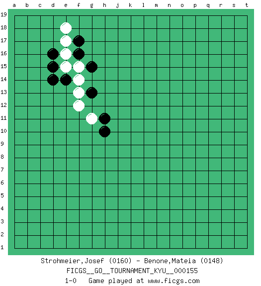 Last move : 1-0 2014 May 16 9:21:37 [Event "FICGS__GO__TOURNAMENT_KYU__000155"] [Site "FICGS"] [Date "2014.03.12"] [Round "1"] [Black "Strohmeier,Josef"] [White "Benone,Mateia"] [Result "1-0"] [Rating 1 "0160"] [Rating 2 "0148"] 1.d16 e17 2.f17 e16 3.f16 e15 4.e14 f14 5.d14 f12 6.g13 f13 7.d15 f15 8.g15 g11 9.h10 e18 10.h11 1-0 This go game has been lost on time (started : 2014.03.12 20:59:2) Here are the names of the openings (joseki) played in the four corners : Corner d16 : d16 e17 Hoshi (Hwajeom, Seongjeom, Xingwei`) 4-4 Point. The star or hoshi (4-4) point, emphasizing influence at the potential expense of territory. Player Black won this Go (weiqi, baduk) game. Follow this game move after move (download)Ikken tobi is never wrong. (Anonymous) Go and wake up your luck. (Persian saying)