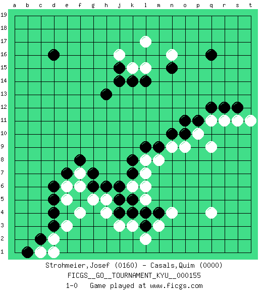 Last move : 1-0 2014 July 23 13:38:34 [Event "FICGS__GO__TOURNAMENT_KYU__000155"] [Site "FICGS"] [Date "2014.03.12"] [Round "1"] [Black "Strohmeier,Josef"] [White "Casals,Quim"] [Result "1-0"] [Rating 1 "0160"] [Rating 2 "0000"] 1.d16 q4 2.q16 e6 3.f8 l8 4.l9 n9 5.n10 o9 6.o10 p10 7.o11 q11 8.q12 r11 9.r12 s11 10.s12 t11 11.p11 q9 12.e7 f6 13.g7 f7 14.d6 e5 15.g6 g5 16.h6 h5 17.j5 f4 18.k8 l7 19.m9 m8 20.k7 k6 21.j6 l5 22.k5 l6 23.d5 j3 24.k4 l2 25.l3 m3 26.l4 n4 27.m4 k3 28.j4 h4 29.d4 e3 30.d3 d2 31.c2 c1 32.b1 d1 33.h13 n16 34.n15 l15 35.k14 k15 36.j15 j16 37.j14 l17 38.l14 1-0 This go game has been lost on time (started : 2014.03.12 20:59:2) Here are the names of the openings (joseki) played in the four corners : Corner d4 : e6 f8 This joseki is unknown. A weak or weird move has probably been played in this corner. Player Black won this Go (weiqi, baduk) game. Follow this game move after move (download)Very few good moves are played. (Pierre Audouard) History is the quarrels of popes and kings, with wars or pestilences in every page; the men all so good for nothing, and hardly any women at all. (Jane Austen)