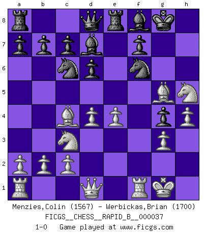 Last move : 1-0 2007 February 28 12:38:8 [Event "FICGS__CHESS__RAPID_B__000037"] [Site "FICGS"] [Date "2007.02.15"] [Round "1"] [White "Menzies,Colin"] [Black "Werbickas,Brian"] [Result "1-0"] [WhiteElo "1567"] [BlackElo "1700"] 1.e4 e5 2.f4 exf4 3.Bc4 d6 4.d4 g5 5.h4 g4 6.Bxf4 Be7 7.g3 Nc6 8.Ne2 h5 9.O-O Nf6 10.Nbc3 O-O 11.Bh6 Re8 12.Nf4 Bf8 13.Bg5 Bd7 14.Nxh5 1-0 KGA : Bishop's gambit Kingside Castling by player White (move 9) Kingside Castling by player Black (move 10) Player White won this chess game. Follow this game move after move (download)Chess is the art which expresses the science of logic. (Mikhail Botvinnik) Ich glaube nicht an Psychologie, ich glaube an gute Züge. (Robert James Fischer) Cuando no sepas que mover, espera por una idea que se le venga a la la cabeza de tu oponente. Tenlo por seguro de que esa idea estará incorrecta. (Siegbert Tarrasch) La menace est plus forte que l'exécution. (Aaron Nimzovitch) Creativity involves breaking out of established patterns in order to look at things in a different way. (Edward De Bono)