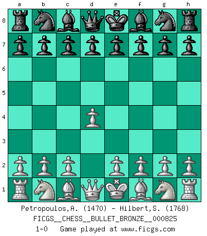 Last move : 1-0 2014 March 16 14:40:44 [Event "FICGS__CHESS__BULLET_BRONZE__000825"] [Site "FICGS"] [Date "2014.03.16"] [Round "1"] [White "Petropoulos,Athanasios"] [Black "Hilbert,Stephan J."] [Result "1-0"] [WhiteElo "1470"] [BlackElo "1768"] 1.d4 1-0 This chess game has been lost on time (started : 2014.03.16 14:32:11) Queen's pawn Player White won this chess game. Follow this game move after move (download)I know people who have all the will in the world, but still can't play good Chess. (Bobby Fischer) Wenn Spassky eine Figur opfert kannst du genauso gut aufgeben. Aber wenn Tal eine Figur opfert, spiel weiter. Er könnte noch eine weitere opfern, und dann ... wer weiß? (Miguel Najdorf) El estómago es una parte esencial del maestro de Ajedrez. (Bent Larsen) Toutes choses étant égales, c'est la conviction qui gagne. Alliée à une volonté de vaincre, elle sert de détonateur, suscite des idées, disperse les doutes et aide à penser clairement. (Robert Fischer) You must do what you feel is right... of course. (Obi-Wan Kenobi in Star Wars ep.4)