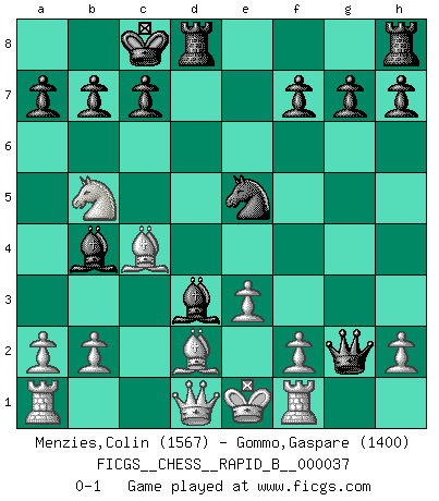 Last move : 0-1 2007 March 1 21:52:28 [Event "FICGS__CHESS__RAPID_B__000037"] [Site "FICGS"] [Date "2007.02.15"] [Round "1"] [White "Menzies,Colin"] [Black "Gommo,Gaspare"] [Result "0-1"] [WhiteElo "1567"] [BlackElo "1400"] 1.c4 e5 2.Nf3 e4 3.Nd4 Nc6 4.Nc2 d5 5.Nc3 dxc4 6.Nxe4 Nf6 7.Nxf6+ Qxf6 8.e3 Bf5 9.Bxc4 Qg6 10.d3 Qxg2 11.Rf1 Ne5 12.Na3 O-O-O 13.Nb5 Bb4+ 14.Bd2 Bxd3 0-1 English, Nimzovich, Flohr variation Queenside Castling by player Black (move 12) Player Black won this chess game. Follow this game move after move (download)The tactician must know what to do whenever something needs doing; the strategist must know what to do when nothing needs doing. (Savielly Tartakover) Gegen einen Schachcomputer zu verlieren ist wie Löcher in den Strümpfen zuhaben. Es ist nicht peinlich, solange man der einzige ist der es weiß. (Anonymous) Tu no necesitas jugar muy bien, únicamente ayudar a tu oponenet a que juegue muy mal. (Genrikh Chepukaitis) Plusieurs personnes se sont demandées comment Tal faisait pour gagner... En fait, c'est très simple ! Il met ses pièces au centre de l'échiquier et les sacrifie quelque part ! (David Bronstein) There are lots of people who mistake their imagination for their memory. (Josh Bilings)