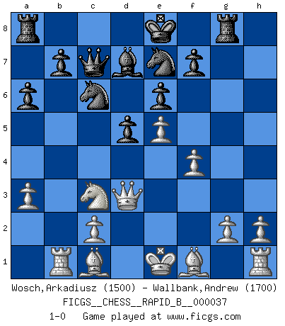 Last move : 1-0 2007 April 11 10:43:10 [Event "FICGS__CHESS__RAPID_B__000037"] [Site "FICGS"] [Date "2007.02.15"] [Round "1"] [White "Wosch,Arkadiusz"] [Black "Wallbank,Andrew"] [Result "1-0"] [WhiteElo "1500"] [BlackElo "1700"] 1.e4 e6 2.d4 d5 3.Nc3 Bb4 4.e5 c5 5.a3 Bxc3+ 6.bxc3 Ne7 7.Qg4 Qc7 8.Qxg7 Rg8 9.Qxh7 cxd4 10.Ne2 Nbc6 11.f4 dxc3 12.Qd3 Bd7 13.Nxc3 a6 14.Rb1 1-0 This chess game has been lost on time (started : 2007.02.15 9:27:51) French : Winawer, Advance, poisoned pawn variation Player White won this chess game. Follow this game move after move (download)White lost because he failed to remember the right continuation and had to think up the moves himself. (Siegbert Tarrasch) Wenn du nicht weißt was du tun sollst, warte bis dein Gegner eine Idee hat. Sie wird sicher schlecht sein. (Siegbert Tarrasch) El Ajedrez es un invernadero donde los frutos del carácter pueden madurar mas completamente que en la vida. (Edward Morgan Foster) Aux échecs, l'amour-propre est satisfait quand on remporte la victoire, mais il n'y a pas de honte à être battu. (Benjamin Franklin) Tree pose grows confidence. It roots me to this world. (Terri Guillemets)