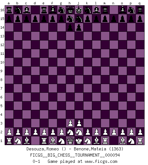 Last move : 0-1 2014 April 17 19:53:21 [Event "FICGS__BIG_CHESS__TOURNAMENT__000094"] [Site "FICGS"] [Date "2014.03.18"] [Round "1"] [White "Desouza,Romeo"] [Black "Benone,Mateia"] [Result "0-1"] [WhiteElo ""] [BlackElo "1363"] 0-1 This big chess game has been lost on time (started : 2014.03.18 15:9:0) Follow this game move after move (download)Combinations have always been the most intriguing aspect of Chess. The masters look for them, the public applauds them, the critics praise them. It is because combinations are possible that Chess is more than a lifeless mathematical exercise. They are the poetry of the game; they are to Chess what melody is to music. They represent the triumph of mind over matter. (Reuben Fine) Alles was am Schachbrett zählt sind gute Züge. (Robert James Fischer) Es muy difícil jugar en contra de la teoría de Einstein. - en su primera derrota en contra de Fischer (Mikhail Tal) Plusieurs personnes se sont demandées comment Tal faisait pour gagner... En fait, c'est très simple ! Il met ses pièces au centre de l'échiquier et les sacrifie quelque part ! (David Bronstein) To err is human, to shift the blame on someone else is tactical. (Mladen Jankovic)