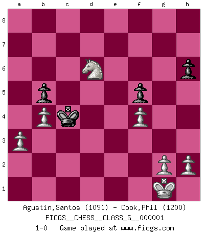 Last move : 1-0 2006 August 12 6:25:54 [Event "FICGS__CHESS__CLASS_G__000001"] [Site "FICGS"] [Date "2006.05.25"] [Round "1"] [White "Agustin,Santos"] [Black "Cook,Phil"] [Result "1-0"] [WhiteElo "1091"] [BlackElo "1200"] 1.c4 Nf6 2.Nc3 c5 3.Nf3 e6 4.e3 Nc6 5.d4 d5 6.cxd5 exd5 7.Bb5 Bg4 8.O-O Bd6 9.dxc5 Bxc5 10.e4 O-O 11.exd5 Nd4 12.Qd3 a6 13.Nxd4 Bxd4 14.Qxd4 axb5 15.b4 Bd7 16.Bg5 h6 17.Bxf6 Qxf6 18.Qxf6 gxf6 19.Rad1 Rac8 20.Rd3 Bf5 21.Re3 Rfe8 22.Rfe1 Kf8 23.Rxe8+ Rxe8 24.Rxe8+ Kxe8 25.Nxb5 Kd7 26.f4 Be4 27.Nc3 Kd6 28.Nxe4+ Kxd5 29.Nxf6+ Kc4 30.a3 b5 31.Ne4 f5 32.Nd6+ 1-0 English Opening Kingside Castling by player White (move 8) Kingside Castling by player Black (move 10) Player White won this chess game. Follow this game move after move (download)Chess is a cold bath for the mind. (Sir John Simon) Wie kann ich Remis annehmen? Ich weiß ja gar nicht, wie ich stehe! (Fritz Sämisch) Yo creo que el Ajedrez posee una magia que es también una ayuda en la edad avanzada. Una rodilla reumática es olvidada durante una partida de Ajedrez y otros eventos pueden parecer algo sin importancia comparada a una catástrofe en el tablero de Ajedrez. (Vlastimil Hort) D'abord les bases : Jouez et étudiez, puis étudiez et jouez, ensuite jouez et étudiez, puis étudiez et jouez. Deuxièmement : Donnez toujours le meilleur de vous-même ! (Ken Smith) Computers have lots of memory but no imagination. (Anonymous)