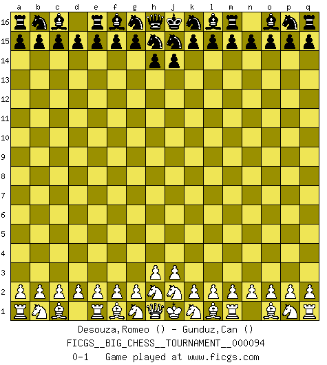 Last move : 0-1 2014 April 17 19:53:21 [Event "FICGS__BIG_CHESS__TOURNAMENT__000094"] [Site "FICGS"] [Date "2014.03.18"] [Round "1"] [White "Desouza,Romeo"] [Black "Gunduz,Can"] [Result "0-1"] [WhiteElo ""] [BlackElo ""] 0-1 This big chess game has been lost on time (started : 2014.03.18 15:9:0) Follow this game move after move (download)I love all positions. Give me a difficult positional game, I will play it. But totally won positions, I cannot stand them. (Hein Donner) Ich kenne keine einzige Person, die behaupten würde, Garri Kasparow sei ein guter Mensch (Nigel Short) Hay jugadores fuertes y personas amables y yo soy un jugador fuerte. (Bobby Fischer) D'abord les bases : Jouez et étudiez, puis étudiez et jouez, ensuite jouez et étudiez, puis étudiez et jouez. Deuxièmement : Donnez toujours le meilleur de vous-même ! (Ken Smith) Don't anthropomorphize computers - they hate it. (Anonymous)