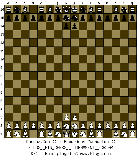 Last move : 0-1 2014 April 17 19:53:21 [Event "FICGS__BIG_CHESS__TOURNAMENT__000094"] [Site "FICGS"] [Date "2014.03.18"] [Round "1"] [White "Gunduz,Can"] [Black "Edwardson,Zachariah"] [Result "0-1"] [WhiteElo ""] [BlackElo ""] 0-1 This big chess game has been lost on time (started : 2014.03.18 15:9:0) Follow this game move after move (download)Methodical thinking is of more use in Chess than inspiration. (C. J. S. Purdy) Schach wird sich dank seiner hohen kulturellen Tradition immer durchsetzen. In näherer Zukunft womöglich sogar als Gegenreaktion auf die maßlose Reizüberflutung im Freizeit- und Spielbereich. (Garry Kasparov) Con el fin de mejorar tu juego, debes de estudiar los finales antes que todo, ya que mientras que los finales pueden ser estudiados y dominados por sí mismos, el juegomedio y la apertura deben de ser estudiados en relación con los finales. (José Raúl Capablanca) 'L'échange des dames est un coup dur pour les deux adversaires...' Un journaliste lors d'une partie du match Spassky-Fischer Always remember that you are unique; just like everyone else. (Unknown)