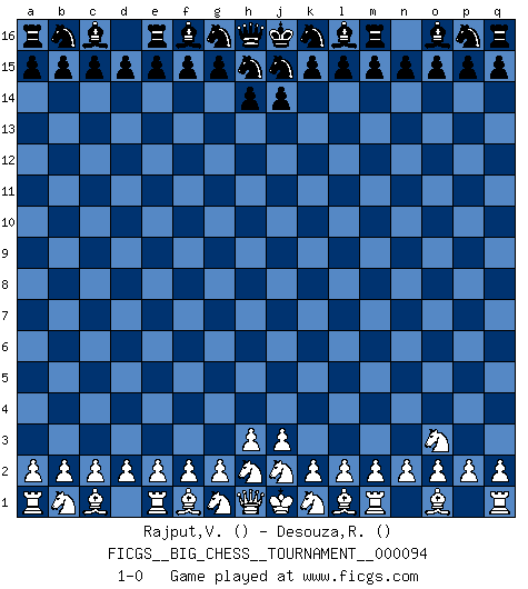 Last move : 1-0 2014 April 18 8:3:57 [Event "FICGS__BIG_CHESS__TOURNAMENT__000094"] [Site "FICGS"] [Date "2014.03.18"] [Round "1"] [White "Rajput,Vishalsingh"] [Black "Desouza,Romeo"] [Result "1-0"] [WhiteElo ""] [BlackElo ""] 1.p1-o3 1-0 This big chess game has been lost on time (started : 2014.03.18 15:9:0) Follow this game move after move (download)Robert Fischer is a law unto himself. (Larry Evans) Es liegt in der Natur, vernüftig zu denken und unlogisch zu handeln. (Anatole France) Un buen sacrificio es aquel que aunque no sea necesariamente sólido, deja a tu oponente aturdido y confuso. (Rudolph Spielmann) Karpov est une pièce de musée. (Garry Kasparov) Luck never made a man wise. (Seneca, Letters to Lucilius)