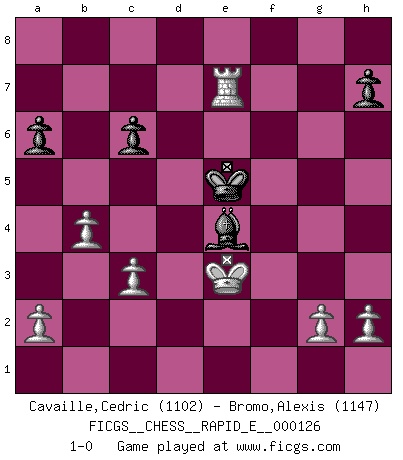 Last move : 1-0 2014 March 24 19:53:18 [Event "FICGS__CHESS__RAPID_E__000126"] [Site "FICGS"] [Date "2014.03.18"] [Round "1"] [White "Cavaille,Cedric"] [Black "Bromo,Alexis"] [Result "1-0"] [WhiteElo "1102"] [BlackElo "1147"] 1.e4 e5 2.Nf3 Nc6 3.Bb5 d6 4.Bxc6+ bxc6 5.d4 Ba6 6.dxe5 dxe5 7.Qxd8+ Rxd8 8.Nxe5 Nf6 9.Nxc6 Bc5 10.Nxd8 Nxe4 11.Be3 Bxe3 12.fxe3 Kxd8 13.Nd2 Re8 14.Nxe4 Rxe4 15.Kf2 f5 16.Rad1+ Ke7 17.Rd4 Bb7 18.Rxe4+ Bxe4 19.c3 Ke6 20.Rd1 c6 21.b4 Ke5 22.Rd7 f4 23.Rxg7 fxe3+ 24.Kxe3 a6 25.Re7+ 1-0 Ruy Lopez : Old Steinitz defense Player White won this chess game. Follow this game move after move (download)If Chess is a science, it's a most inexact one. If Chess is an art, it is too exacting to be seen as one. If Chess is a sport, it's too esoteric. If Chess is a game, it's too demanding to be just a game. If Chess is a mistress, she's a demanding one. If Chess is a passion, it's a rewarding one. If Chess is life, it's a sad one. (Unknown) Du musst Deinen Gegner in einen tiefen dunklen Wald führen wo 2+2=5 ist und wo der Weg, der wieder hinausführt, nur breit genug für einen ist. (Mikhail Nekhemyevich Tal) El jugador táctico sabe que hacer cuando hay algo que hacer; mientras que el estratega sabe que hacer cuando no hay nada que hacer. (Gerald Abrahams) Assurément je connaissais par expérience le mystérieux attrait de ce jeu royal, le seul entre tous les jeux inventés par les hommes qui échappe souverainement à la tyrannie du hasard, le seul où l'on ne doive sa victoire qu'à son intelligence ou plutôt à une certaine forme d'intelligence. Mais n'est-ce pas déjà le limiter injurieusement que d'appeler les échecs un jeu ? N'est-ce pas une science, un art ou quelque chose qui, comme le cercueil de Mahomet entre ciel et terre, est suspendu entre l'un et l'autre, et qui réunit un nombre incroyable de contraires ? [...] C'est une pensée qui ne mène à rien, une mathématique qui n'établit rien, un art qui ne laisse pas d'uvre, une architecture sans matière; et il l'a prouvé néanmoins qu'il était plus durable, à sa manière, que les livres ou que tout autre monument, ce jeu unique qui appartient à tous les peuples et à tous les temps, et dont personne ne sait quel dieu en fit don à la terre pour tuer l'ennui, pour aiguiser l'esprit et stimuler l'âme. Où commence-t-il, où finit-il ? (Stefan Zweig) Beep ! (R2D2 in Star Wars ep.3)