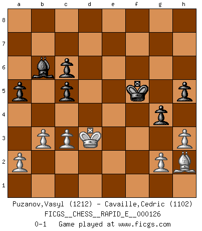 Last move : 0-1 2014 May 31 22:12:13 [Event "FICGS__CHESS__RAPID_E__000126"] [Site "FICGS"] [Date "2014.03.18"] [Round "1"] [White "Puzanov,Vasyl"] [Black "Cavaille,Cedric"] [Result "0-1"] [WhiteElo "1212"] [BlackElo "1102"] 1.e4 e5 2.Nf3 Nc6 3.Bb5 d6 4.d4 exd4 5.Nxd4 Bd7 6.Bxc6 Bxc6 7.Nxc6 bxc6 8.O-O Nf6 9.Qd3 Be7 10.h3 O-O 11.Nc3 c5 12.f4 c6 13.e5 dxe5 14.Qxd8 Rfxd8 15.fxe5 Nd5 16.Ne4 f6 17.exf6 Nxf6 18.Nxf6+ Bxf6 19.c3 a5 20.Bf4 Kf7 21.Rad1 Rxd1 22.Rxd1 Rd8 23.Rxd8 Bxd8 24.b3 Bb6 25.Kf1 Ke6 26.Ke2 h5 27.Kd3 Kf5 28.Bg3 g5 29.Bh2 g4 0-1 This chess game has been lost on time (started : 2014.03.18 19:56:6) Ruy Lopez : Old Steinitz defense Kingside Castling by player White (move 8) Kingside Castling by player Black (move 10) Player Black won this chess game. Follow this game move after move (download)Via the squares on the chessboard, the Indians explain the movement of time and the age, the higher influences which control the world and the ties which link Chess with the human soul. (Al-Masudi) Ein Teil des Fehlers ist immer korrekt. (Savielly Grigorievitsch Tartakower) Yo no creo en la psicología. Yo creo en las buenas movidas. (Bobby Fischer) Le profane ne songe pas à la somme de jouissance dont il se prive, qui méconnaît ce jeu aux ressources aussi variées que passionnantes. (Jean-Marie Jeanton-Lamarche) Being number two sucks. (Andre Agassi)