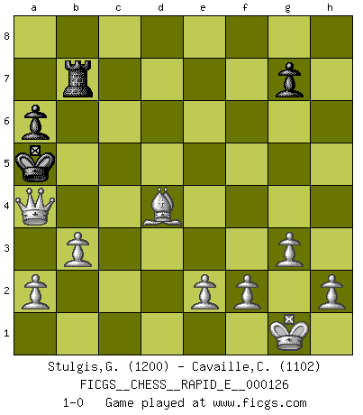 Last move : 1-0 2014 March 24 15:39:49 [Event "FICGS__CHESS__RAPID_E__000126"] [Site "FICGS"] [Date "2014.03.18"] [Round "1"] [White "Stulgis,Gintautas"] [Black "Cavaille,Cedric"] [Result "1-0"] [WhiteElo "1200"] [BlackElo "1102"] 1.c4 c5 2.Nc3 d6 3.g3 Qd7 4.Bg2 Nc6 5.Nf3 Nf6 6.O-O e6 7.d4 cxd4 8.Nxd4 Nxd4 9.Qxd4 Be7 10.Rd1 O-O 11.b3 e5 12.Qd3 a6 13.Ba3 Rd8 14.Ne4 Nxe4 15.Bxe4 Rb8 16.Bxh7+ Kf8 17.Be4 b5 18.cxb5 Qxb5 19.Qf3 Bb7 20.Qh5 Ke8 21.Bxb7 Qxb7 22.Qh8+ Bf8 23.Rxd6 Ke7 24.Rb6 Kd7 25.Rxb7+ Rxb7 26.Rd1+ Kc8 27.Rxd8+ Kxd8 28.Qxf8+ Kd7 29.Qxf7+ Kc6 30.Qe6+ Kc7 31.Bd6+ Kc6 32.Bxe5 Kc5 33.Qc4+ Kb6 34.Bd4+ Ka5 35.Qa4+ 1-0 English : Symmetrical variation Kingside Castling by player White (move 6) Kingside Castling by player Black (move 10) Player White won this chess game. Follow this game move after move (download)Chess is a sea in which a gnat may drink and an elephant may bathe. (Hindu proverb) Ich möchte Schüler heranbilden, die das Vermögen haben, selbst zu denken und Kritik zu üben. (Emanuel Lasker) Te sientas frente a un tablero y repentinamente tu corazón brinca. Tu mano tiembla al tomar una pieza y moverla. Pero lo que el Ajedrez te enseña es que tu debes permanecer ahí con calma y pensar de que si realmente es una buena idea o de que si hay otras ideas mejores. (Stanley Kubrick) Le système Elo représente seulement une moyenne. Il est simplement un indicateur de votre stabilité. (Anatoli Karpov) When you stop learning you start dying. (Scott Adams)