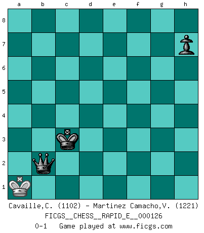 Last move : 0-1 2014 May 18 16:57:13 [Event "FICGS__CHESS__RAPID_E__000126"] [Site "FICGS"] [Date "2014.03.18"] [Round "1"] [White "Cavaille,Cedric"] [Black "Martinez Camacho,Victor Hugo"] [Result "0-1"] [WhiteElo "1102"] [BlackElo "1221"] 1.e4 e5 2.Nf3 Nc6 3.Bb5 a6 4.Bxc6 dxc6 5.Nxe5 Qd4 6.Qf3 Qxe5 7.d3 Nf6 8.Qf4 Bd6 9.Qxe5+ Bxe5 10.O-O Be6 11.Nd2 O-O 12.Nf3 Nd7 13.Nxe5 Nxe5 14.f4 Ng4 15.f5 Bd7 16.h3 Nf6 17.Bg5 Ne8 18.Be7 c5 19.Bxf8 Kxf8 20.g4 Bc6 21.g5 c4 22.f6 cxd3 23.cxd3 Rd8 24.Rad1 gxf6 25.gxf6 Rd6 26.e5 Rd4 27.Rfe1 Bd5 28.b3 Rh4 29.Kh2 Be6 30.Re3 c6 31.Re4 Rxh3+ 32.Kg1 Nc7 33.Kf2 Nd5 34.R4e1 Rh2+ 35.Kg3 Rxa2 36.d4 Ra3 37.Rd3 Nb4 38.Rf3 Nc2 39.Rd1 Nb4 40.Rh1 Kg8 41.Kf2 Ra2+ 42.Kf1 Ra1+ 43.Kg2 Rxh1 44.Kxh1 Bd5 45.Kg2 Bxf3+ 46.Kxf3 Nd5 47.Ke4 a5 48.Kd3 b5 49.Ke4 a4 50.bxa4 bxa4 51.Kf5 a3 52.e6 fxe6+ 53.Kxe6 a2 54.Kd6 Nxf6 55.Kxc6 a1Q 56.d5 Nxd5 57.Kxd5 Kf7 58.Ke4 Qc3 59.Kd5 Kf6 60.Ke4 Qe5+ 61.Kd3 Qf4 62.Kc3 Qe4 63.Kd2 Qf3 64.Kc2 Qe3 65.Kb2 Qd3 66.Ka2 Qb5 67.Ka3 Ke5 68.Ka2 Qb4 69.Ka1 Kd4 70.Ka2 Kc3 71.Ka1 Qb2+ 0-1 Ruy Lopez : Exchange variation Kingside Castling by player White (move 10) Kingside Castling by player Black (move 11) 10 pieces endgame at move 50 : White KPPP , Black KNPPPP WHITE : King + 3 Pawns BLACK : King + 1 Knight 4 Pawns 9 pieces endgame at move 52 : White KPP , Black KNPPPP WHITE : King + 2 Pawns BLACK : King + 1 Knight 4 Pawns 8 pieces endgame at move 53 : White KPP , Black KNPPP WHITE : King + 2 Pawns BLACK : King + 1 Knight 3 Pawns 7 pieces endgame at move 54 : White KP , Black KNPPP WHITE : King + 1 Pawn BLACK : King + 1 Knight 3 Pawns 6 pieces endgame at move 55 : White KP , Black KNPP WHITE : King + 1 Pawn BLACK : King + 1 Knight 2 Pawns Promotion Queen by player Black (move 55) 5 pieces endgame at move 56 : White K , Black KQNP WHITE : King + BLACK : King + 1 Queen 1 Knight 1 Pawn 4 pieces endgame at move 57 : White K , Black KQP WHITE : King + BLACK : King + 1 Queen 1 Pawn Player Black won this chess game. Follow this game move after move (download)Kasparov : J'adoube , Ivanchuk : S'il vous plaît ! (Garry Kasparov & Vassily Ivanchuk, Linares 1997) Alle offensichtlichen Züge sehen nach dem Spiel in der Analyse verdächtig aus. (Viktor Kortschnoi) Existen dos clases de sacrificios: los correctos y los mÃos. (Mikhail Tal) Ce qui est bien, c'est d'avoir tout un tas de pièces en prise : l'adversaire ne peut en prendre qu'une à la fois. Cité par Thierry Audin. Humor is by far the most significant activity of the human brain. (Edward De Bono)