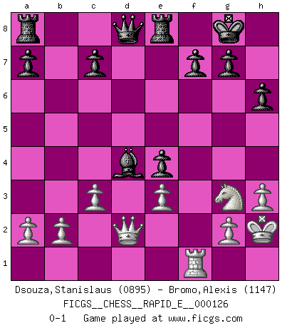 Last move : 0-1 2014 May 23 9:44:33 [Event "FICGS__CHESS__RAPID_E__000126"] [Site "FICGS"] [Date "2014.03.18"] [Round "1"] [White "Dsouza,Stanislaus"] [Black "Bromo,Alexis"] [Result "0-1"] [WhiteElo "0895"] [BlackElo "1147"] 1.e4 e5 2.Nf3 Nc6 3.Bb5 d6 4.Bxc6+ bxc6 5.d3 h6 6.O-O Nf6 7.Be3 Ba6 8.Nc3 Be7 9.Qd2 O-O 10.Ne2 Ng4 11.h3 Nxe3 12.fxe3 Bf6 13.Ng3 d5 14.exd5 cxd5 15.c3 Re8 16.Kh2 e4 17.dxe4 Bxf1 18.Rxf1 dxe4 19.Nd4 Bxd4 0-1 This chess game has been lost on time (started : 2014.03.18 19:56:6) Ruy Lopez : Old Steinitz defense Kingside Castling by player White (move 6) Kingside Castling by player Black (move 9) Player Black won this chess game. Follow this game move after move (download)There are tough players and nice guys, and I'm a tough player. (Bobby Fischer) Der beste Spieler in einem Turnier gewinnt es nie. Er landet auf Platz zwei oder drei. (Siegbert Tarrasch) Buenas posiciones no logran ganar juegos, buenas movidas sí. (Gerald Abrahams) Les échecs, c'est l'art d'analyser. (Mikhail Botvinnik) Work expands to fill the time available. (C. Northcote Parkinson, in Parkinson's Laws)