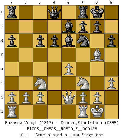 Last move : 0-1 2014 May 31 23:50:55 [Event "FICGS__CHESS__RAPID_E__000126"] [Site "FICGS"] [Date "2014.03.18"] [Round "1"] [White "Puzanov,Vasyl"] [Black "Dsouza,Stanislaus"] [Result "0-1"] [WhiteElo "1212"] [BlackElo "0895"] 1.e4 e5 2.Nf3 Nc6 3.Bb5 d6 4.d4 a6 5.Bxc6+ bxc6 6.dxe5 Bg4 7.exd6 cxd6 8.Nc3 Nf6 9.Bg5 Be7 10.Qe2 O-O 11.h3 Be6 12.O-O h6 0-1 Ruy Lopez : Old Steinitz defense Kingside Castling by player Black (move 10) Kingside Castling by player White (move 12) Player Black won this chess game. Follow this game move after move (download)I know people who have all the will in the world, but still can't play good Chess. (Bobby Fischer) Er war ein guter Schachspieler, aber ich kann Leute nicht ausstehen, die 'Heil Hitler' rufen (Über Alexander Aljechin). (Miguel Najdorf) El Ajedrez es el juego mas altamente simbólico, pero las agresiones estan por lo tanto aún mas francamente representadas en la partida. Tal vez comenzo como un juego de guerra; Algo como la representación de una batalla en miniatura entre las fuerzas de dos reinos. (Karl Meninger) Vous savez, camarade Pachman, je n'éprouve pas de plaisir à être ministre, je jouerais plutôt aux échecs comme vous, ou alors ferais une révolution au Venezuela. (Che Guevara à Ludek Pachman, 'Checkmate in Prague', 1975) Creativity is allowing yourself to make mistakes. Art is knowing which ones to keep. (Scott Adams)