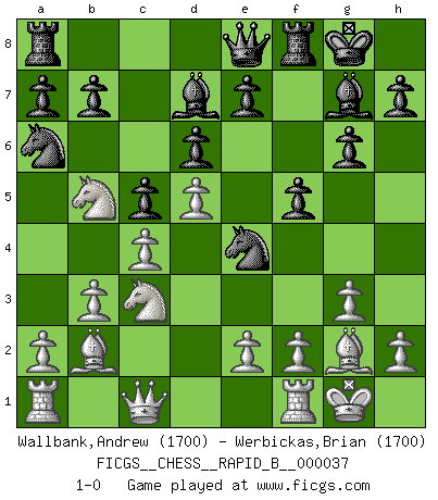 Last move : 1-0 2007 April 28 0:57:47 [Event "FICGS__CHESS__RAPID_B__000037"] [Site "FICGS"] [Date "2007.02.15"] [Round "1"] [White "Wallbank,Andrew"] [Black "Werbickas,Brian"] [Result "1-0"] [WhiteElo "1700"] [BlackElo "1700"] 1.d4 f5 2.g3 g6 3.Bg2 d6 4.Nf3 Bg7 5.O-O Nf6 6.c4 O-O 7.Nc3 c6 8.b3 Na6 9.Bb2 Qe8 10.d5 Ne4 11.Nd4 c5 12.Ndb5 Bd7 13.Qc1 1-0 This chess game has been lost on time (started : 2007.02.15 9:27:51) Dutch defense Kingside Castling by player White (move 5) Kingside Castling by player Black (move 6) Player White won this chess game. Follow this game move after move (download)Bobby is the most misunderstood, misquoted celebrity walking the face of this earth. (Yasser Seirawan) Am wohlsten fühle ich mich, wenn ich sehe, wie sich mein Gegner im Todeskampf windet. (Robert James Fischer) Uno por uno, yo los acribillé, mi superioridad muy pronto se volvio aparente. (Jose Capablanca) On est toujours la mazette de quelqu'un d'autre. (Anonyme) Luck never made a man wise. (Seneca, Letters to Lucilius)