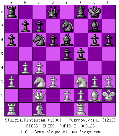 Last move : 1-0 2014 May 1 19:49:30 [Event "FICGS__CHESS__RAPID_E__000126"] [Site "FICGS"] [Date "2014.03.18"] [Round "1"] [White "Stulgis,Gintautas"] [Black "Puzanov,Vasyl"] [Result "1-0"] [WhiteElo "1200"] [BlackElo "1212"] 1.c4 e5 2.Nc3 Nc6 3.g3 g6 4.Bg2 Bg7 5.Nf3 Nge7 6.O-O d6 7.d3 O-O 8.h3 Be6 9.Kh2 a6 10.a3 h6 11.Qc2 f5 12.b4 1-0 English : Closed system Kingside Castling by player White (move 6) Kingside Castling by player Black (move 7) Player White won this chess game. Follow this game move after move (download)In order to improve your game, you must study the endgame before everything else, for whereas the endings can be studied and mastered by themselves, the middle game and the opening must be studied in relation to the endgame. (Jose Raul Capablanca) Ich weiss nicht was Gott gegen mich auf 1.e4 antworten würde. (Robert James Fischer) El Ajedrez es despiadado: debes de estar preparado para matar gente. (Nigel Short) Mais l'homme est une créature légère et illogique : semblable au joueur d'échecs, il n'aime que le processus du but à atteindre, non le but lui-même. (Dostoïevsky) Hold em is to stud what chess is to checkers. (Johnny Moss)