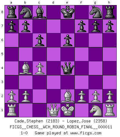 Last move : 1-0 2014 June 7 10:50:52 [Event "FICGS__CHESS__WCH_ROUND_ROBIN_FINAL__000011"] [Site "FICGS"] [Date "2014.04.16"] [Round "1"] [White "Cade,Stephen"] [Black "Lopez,Jose"] [Result "1-0"] [WhiteElo "2183"] [BlackElo "2358"] 1.d4 d5 2.c4 e6 3.Nc3 c6 4.e4 dxe4 5.Nxe4 Bb4+ 6.Bd2 Qxd4 7.Bxb4 Qxe4+ 8.Be2 1-0 This chess game has been lost on time (started : 2014.04.16 11:29:21) QGD : Semi-Slav, Marshall gambit Player White won this chess game. Follow this game move after move (download)After a bad opening, there is hope for the middle game. After a bad middle game, there is hope for the endgame. But once you are in the endgame, the moment of truth has arrived. (Edmar Mednis) Gewinnen beim Schach fördert das Selbstvertrauen. Beim Sex spüre ich sowas nicht... (Garry Kasparov) En el Ajedrez, tal como en la vida, las bendiciones de hoy pueden ser el veneno del mañana. (Assaic) Mais n'est-ce pas déjà le limiter injurieusement que d'appeler les échecs un jeu? N'est-ce pas aussi une science, un art, ou quelque chose qui, comme le cercueil de Mahomet entre ciel et terre, est suspendu entre l'un et l'autre, et qui réunit un nombre incroyable de contraires ? (Stefan Zweig) Hello Thibault, if I have had a plan (and I had one, I hope), I have forgotten it during the last week... - Hello Heinz-Georg. What do you mean a plan ? (Anonymous players, during a Big Chess game)
