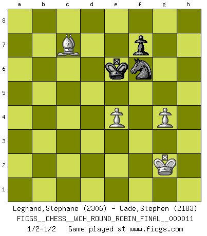 Last move : 1/2-1/2 2014 July 15 15:33:15 [Event "FICGS__CHESS__WCH_ROUND_ROBIN_FINAL__000011"] [Site "FICGS"] [Date "2014.04.16"] [Round "1"] [White "Legrand,Stephane"] [Black "Cade,Stephen"] [Result "1/2-1/2"] [WhiteElo "2306"] [BlackElo "2183"] 1.d4 d5 2.c4 c6 3.Nf3 Nf6 4.Nc3 e6 5.e3 Nbd7 6.Qc2 Bd6 7.Be2 O-O 8.O-O dxc4 9.Bxc4 a6 10.b3 b5 11.Bd3 Qc7 12.Bb2 Bb7 13.Rac1 Rfc8 14.Ne4 Nxe4 15.Bxe4 Nf6 16.Bd3 c5 17.Qe2 Qe7 18.dxc5 Bxc5 19.a4 Bd5 20.axb5 axb5 21.Nd2 Bb4 22.Bxb5 Bxd2 23.Rxc8+ Rxc8 24.Qxd2 Bxg2 25.Rc1 Rxc1+ 26.Qxc1 Qb7 27.Qd1 Qxb5 28.Kxg2 Qg5+ 29.Kf1 Ng4 30.Qd6 Qb5+ 31.Kg1 h5 32.Qd8+ Kh7 33.Qd4 Nf6 34.b4 e5 35.Qxe5 Qxb4 36.h3 Qe4 37.Kh2 Qxe5+ 38.Bxe5 Kg6 39.f3 Kf5 40.Bc7 g5 41.Kg2 g4 42.e4+ Ke6 43.hxg4 hxg4 44.fxg4 1/2-1/2 QGD Slav : 4.Nc3 Kingside Castling by player Black (move 7) Kingside Castling by player White (move 8) 10 pieces endgame at move 38 : White KBPPP , Black KNPPP WHITE : King + 1 Bishop 3 Pawns BLACK : King + 1 Knight 3 Pawns 9 pieces endgame at move 43 : White KBPPP , Black KNPP WHITE : King + 1 Bishop 3 Pawns BLACK : King + 1 Knight 2 Pawns 8 pieces endgame at move 43 : White KBPP , Black KNPP WHITE : King + 1 Bishop 2 Pawns BLACK : King + 1 Knight 2 Pawns 7 pieces endgame at move 44 : White KBPP , Black KNP WHITE : King + 1 Bishop 2 Pawns BLACK : King + 1 Knight 1 Pawn This chess game ended in a draw. Follow this game move after move (download)It is peculiar but a fact nevertheless, that gamblers in chess always have enthusiastic followers. (Botvinnik) Ich bin Weltmeister und muß mit niemandem irgend etwas diskutieren. (Viswanathan Anand) Por la belleza de sus partidas, la claridad de su juego y lo brillante de sus ideas, Fischer se creó el mismo como un artista de la misma estatura como Brahms, Rembrandt y Shakespeare. (David Levy) Il a essayé de se convaincre qu'il pourrait empêcher toutes les erreurs et ne jamais perdre. L'horreur ! Gary Kasparov au sujet de Robert Fischer. The man who strikes first admits that his ideas have given out. (Chinese proverb)