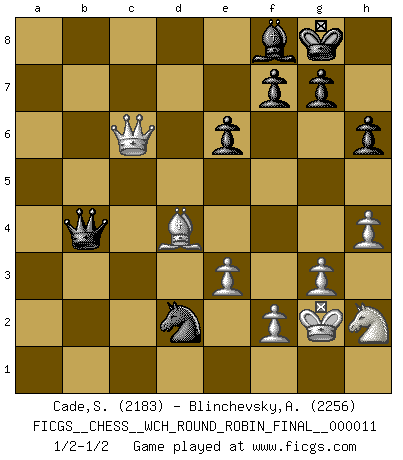 Last move : 1/2-1/2 2014 July 22 12:10:21 [Event "FICGS__CHESS__WCH_ROUND_ROBIN_FINAL__000011"] [Site "FICGS"] [Date "2014.04.16"] [Round "1"] [White "Cade,Stephen"] [Black "Blinchevsky,Alexander"] [Result "1/2-1/2"] [WhiteElo "2183"] [BlackElo "2256"] 1.d4 d5 2.c4 c6 3.Nf3 Nf6 4.Nc3 e6 5.e3 Nbd7 6.Qc2 Bd6 7.Bd3 O-O 8.O-O dxc4 9.Bxc4 a6 10.Rd1 b5 11.Bd3 Bb7 12.Ng5 h6 13.Nge4 Be7 14.a3 a5 15.b3 Rc8 16.Bb2 Qb6 17.Nxf6+ Nxf6 18.Qe2 Rfd8 19.Rac1 Rc7 20.Rc2 Ra8 21.Rdc1 Ba6 22.Nb1 Rac8 23.Nd2 c5 24.dxc5 Rxc5 25.Rxc5 Rxc5 26.Rxc5 Qxc5 27.a4 bxa4 28.Bxa6 a3 29.Bd4 Qc1+ 30.Nf1 Qb1 31.Qb5 Ne4 32.Qxa5 a2 33.Bd3 Qxd3 34.Qxa2 Bh4 35.g3 Be7 36.h4 Bb4 37.Qa8+ Bf8 38.Qc6 Qb1 39.Kg2 Bd6 40.Nh2 Kh7 41.Qd7 Kg8 42.Qe8+ Bf8 43.Qc6 Nd2 44.b4 Qxb4 1/2-1/2 QGD Slav : 4.Nc3 Kingside Castling by player Black (move 7) Kingside Castling by player White (move 8) This chess game ended in a draw. Follow this game move after move (download)A Chess game is divided into three stages: the first, when you hope you have the advantage, the second when you believe you have an advantage, and the third... when you know you're going to lose ! (Savielly Tartakower) Ich verachte die Medien. (Robert James Fischer) Yo adoro todas la posiciones. Denme una partida posicional difícil, y la jugaré. Pero posiciones totalmente ganadas, no las tolero. (Hein Donner) La guerre est enfant de la passion, la passion est enfant du narcissisme et le narcissisme est l'enfant. (...) Une autre partie ? (Thibault de Vassal) Lamb in skin of tiger, still fears the wolf. (Chinese proverb)