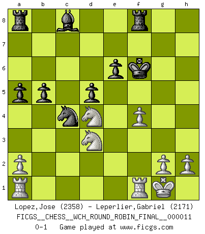 Last move : 0-1 2014 June 18 11:27:24 [Event "FICGS__CHESS__WCH_ROUND_ROBIN_FINAL__000011"] [Site "FICGS"] [Date "2014.03.18"] [Round "1"] [White "Lopez,Jose"] [Black "Leperlier,Gabriel"] [Result "0-1"] [WhiteElo "2358"] [BlackElo "2171"] 1.e4 e6 2.d4 d5 3.Nc3 Nf6 4.e5 Nfd7 5.f4 c5 6.Nf3 Nc6 7.Be3 Qb6 8.Na4 Qa5+ 9.c3 cxd4 10.b4 Nxb4 11.cxb4 Bxb4+ 12.Bd2 Bxd2+ 13.Nxd2 O-O 14.Bd3 b5 15.Nb2 Nb6 16.O-O Nc4 17.Bxh7+ Kxh7 18.Qh5+ Kg8 19.Nf3 g6 20.Qh6 Qc7 21.Nxd4 f6 22.Qxg6+ Qg7 23.Qxg7+ Kxg7 24.exf6+ Kxf6 25.Nd3 a5 0-1 This chess game has been lost on time (started : 2014.03.18 23:0:36) French : Steinitz, Boleslavsky variation Kingside Castling by player Black (move 13) Kingside Castling by player White (move 16) Player Black won this chess game. Follow this game move after move (download)The boy (then a 12 year old boy named Anatoly Karpov) doesn't have a clue about Chess, and there's no future at all for him in this profession. (Mikhail Botvinnik) Ein Buch ist ein Spiegel; wenn ein Affe hineinsieht, so kann kein Apostel heraus gucken. (Georg Christoph Lichtenberg) Cuando tengo las piezas blancas, yo gano porque soy blanco; Cuando tengo las piezas negras, yo gano porque soy Bogolyubov. (Bogolyubov) Le succès, c'est être capable d'aller d'échec en échec sans perdre son enthousiasme. (Winston Churchill) We're missing something. (Gregory House, House M.D.)