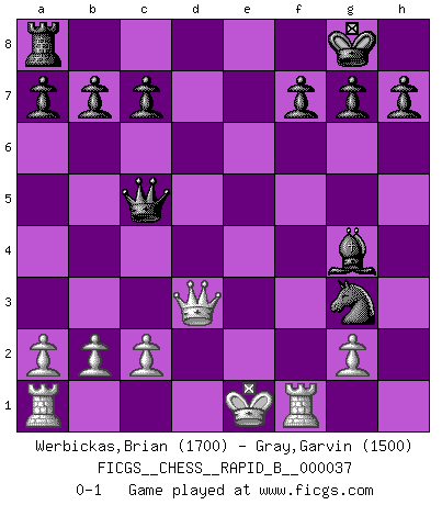 Last move : 0-1 2007 March 2 8:24:18 [Event "FICGS__CHESS__RAPID_B__000037"] [Site "FICGS"] [Date "2007.02.15"] [Round "1"] [White "Werbickas,Brian"] [Black "Gray,Garvin"] [Result "0-1"] [WhiteElo "1700"] [BlackElo "1500"] 1.f4 e5 2.fxe5 d6 3.exd6 Bxd6 4.Nf3 Nf6 5.d4 O-O 6.e4 Nxe4 7.Bd3 Re8 8.O-O Nc6 9.Bxe4 Rxe4 10.Qd3 Rg4 11.Nc3 Nxd4 12.Ng5 Rxg5 13.Bxg5 Qxg5 14.Ne4 Bxh2+ 15.Kxh2 Qh5+ 16.Kg3 Ne2+ 17.Kf2 Bg4 18.Ng3 Qc5+ 19.Ke1 Nxg3 0-1 Bird : From gambit Kingside Castling by player Black (move 5) Kingside Castling by player White (move 8) Player Black won this chess game. Follow this game move after move (download)I have always a slight feeling of pity for the man who has no knowledge of Chess. (Siegbert Tarrasch) Im Schach gibt es keinen Platz für Galanterie. (Irving Chernev) Una buena ofensiva y una buena defensa, comienzan ambas con un buen desarrollo. (Bruce A. Moon) L'ordinateur a tué l'originalité. Il n'y a plus guère d'aventures sur l'échiquier. (Jacob Murray) If you lose the game you should win the analysis! (Proverb)