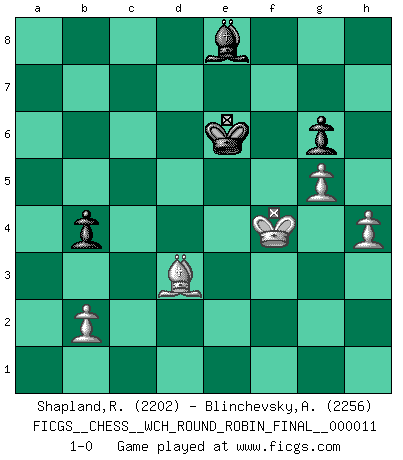 Last move : 1-0 2014 August 11 16:39:40 [Event "FICGS__CHESS__WCH_ROUND_ROBIN_FINAL__000011"] [Site "FICGS"] [Date "2014.03.18"] [Round "1"] [White "Shapland,Roy"] [Black "Blinchevsky,Alexander"] [Result "1-0"] [WhiteElo "2202"] [BlackElo "2256"] 1.d4 d5 2.c4 c6 3.Nf3 Nf6 4.Nc3 e6 5.Bg5 h6 6.Bxf6 Qxf6 7.e3 Nd7 8.Be2 dxc4 9.O-O g6 10.Ne4 Qe7 11.Ne5 Bg7 12.f4 O-O 13.Bxc4 Nf6 14.Bd3 Nd5 15.Qe1 Rd8 16.Rc1 Bd7 17.g4 Be8 18.g5 a5 19.gxh6 Bxh6 20.Qg3 Bg7 21.Qh3 f5 22.Ng5 Bf6 23.Qg3 Rac8 24.Rfe1 Bxg5 25.Qxg5 Qxg5+ 26.fxg5 Kg7 27.Kf2 c5 28.Rxc5 Rxc5 29.dxc5 Nb4 30.Bc4 Rc8 31.c6 Bxc6 32.a3 Nd5 33.Re2 b5 34.Bd3 Be8 35.Rc2 Rxc2+ 36.Bxc2 Kf8 37.e4 Nf4 38.h4 Ke7 39.Kf3 Nh5 40.exf5 exf5 41.Nd3 Ng7 42.Nf4 Ne6 43.Nxe6 Kxe6 44.Kf4 b4 45.Bb3+ Kd6 46.axb4 axb4 47.Bc4 Kc5 48.Be6 Kd6 49.Bb3 Ke7 50.Ke5 f4 51.Kxf4 Kd6 52.Bc2 Ke6 53.Bd3 1-0 QGD Slav : 4.Nc3 Kingside Castling by player White (move 9) Kingside Castling by player Black (move 12) 10 pieces endgame at move 46 : White KBPPP , Black KBPPP WHITE : King + 1 Bishop 3 Pawns BLACK : King + 1 Bishop 3 Pawns 9 pieces endgame at move 51 : White KBPPP , Black KBPP WHITE : King + 1 Bishop 3 Pawns BLACK : King + 1 Bishop 2 Pawns Player White won this chess game. Follow this game move after move (download)A great player and a great example for many. His book My 60 Memorable Games had a big impact on me. It is a shame he didn't continue to enrich the world of chess with his unparalleled understanding after 1972. (Jan Timman, about Bobby Fischer's death) Nach Morphy wurde nichts neues mehr in der Behandlung offener Positionen gefunden. (Mikhail Moiseyevich Botvinik) Si el Ajedrez es una ciencia, es la mas inexacta. Si el Ajedrez es un arte, es demasiado inexacto para ser visto como tal. Si el Ajedrez es un deporte, es demasiado esotérico. Si el Ajedrez es un juego, es demasiado exigente para ser solo un juego. Si el Ajedrez es una aventura, es una muy demandante. Si el Ajedrez es una pasión, es una muy gratificante. Si el Ajedrez es la vida, es una muy triste. (Anónimo) A chaque perte on perd un peu de soi. (Joël Lautier) Don't be irreplaceable, if you can't be replaced, you can't be promoted. (Dan Rotaru)