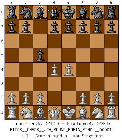 Last move : 1-0 2014 April 5 18:28:11 [Event "FICGS__CHESS__WCH_ROUND_ROBIN_FINAL__000011"] [Site "FICGS"] [Date "2014.03.18"] [Round "1"] [White "Leperlier,Gabriel"] [Black "Sharland,Michael"] [Result "1-0"] [WhiteElo "2171"] [BlackElo "2254"] 1.e4 c5 2.d4 1-0 Sicilian : Smith-Morra gambit Player White won this chess game. Follow this game move after move (download)The way he plays Chess demonstrates a man's whole nature. (Stanley Ellin) Man braucht nicht immer den besten Zug zu spielen: Ein Zug muß aktiv, unternehmungslustig, korrekt und schön sein. (David Bronstein) ¿Esta Bobby Fischer algo cuerdo?. (Salo Flohr) Votre prénom est 'Tactique', votre deuxième prénom est 'Tactique' et votre nom est 'Tactique'. (Ken Smith) You know what they say : You lie down with the Devil, you wake up in Hell. (Horatio Caine, C.S.I. Miami)