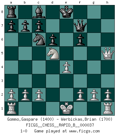 Last move : 1-0 2007 February 20 16:33:1 [Event "FICGS__CHESS__RAPID_B__000037"] [Site "FICGS"] [Date "2007.02.15"] [Round "1"] [White "Gommo,Gaspare"] [Black "Werbickas,Brian"] [Result "1-0"] [WhiteElo "1400"] [BlackElo "1700"] 1.e4 e5 2.Nf3 f5 3.Nxe5 Qf6 4.Nc4 fxe4 5.Nc3 Qg6 6.d3 Bb4 7.Bd2 Bxc3 8.Bxc3 Nf6 9.Bxf6 gxf6 10.Ne3 Nc6 11.Be2 h5 12.dxe4 d6 13.Nd5 Qf7 14.Bxh5 Rxh5 15.Qxh5 1-0 Latvian counter-gambit Player White won this chess game. Follow this game move after move (download)In Fischer's hands, a slight theoretical advantage is as good a being a Queen ahead. (Isaac Kashdan) Es macht mich traurig, wenn ich sehe, dass Golfprofis mehr verdienen als Schachsportler. Obwohl ich davon überzeugt bin, dass wir Schachspieler viel härter trainieren müssen als die Golfer. (Alexandra Kosteniuk) El Ajedrez es tan inspirador que yo no creo que un buen jugador sea capaz de tener un pensamiento malo durante una partida. (Wilhelm Steinitz) D'abord les bases : Jouez et étudiez, puis étudiez et jouez, ensuite jouez et étudiez, puis étudiez et jouez. Deuxièmement : Donnez toujours le meilleur de vous-même ! (Ken Smith) After growing wildly for years, the field of computing appears to be reaching its infancy. (John Pierce)