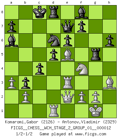 Last move : 1/2-1/2 2014 May 13 21:12:15 [Event "FICGS__CHESS__WCH_STAGE_2_GROUP_01__000012"] [Site "FICGS"] [Date "2014.03.18"] [Round "1"] [White "Komaromi,Gabor"] [Black "Antonov,Vladimir"] [Result "1/2-1/2"] [WhiteElo "2126"] [BlackElo "2329"] 1.d4 d5 2.c4 c6 3.Nf3 Nf6 4.Nc3 e6 5.Bg5 h6 6.Bh4 dxc4 7.e4 g5 8.Bg3 b5 9.Be2 Bb7 10.h4 g4 11.Ne5 Nbd7 12.Bxg4 Nxe5 13.Bxe5 Rg8 14.Bh3 b4 15.Ne2 Nxe4 16.Nf4 Qxh4 17.Qe2 Nd6 18.a3 b3 19.Rc1 Qe7 20.Nh5 Rg6 21.O-O O-O-O 22.Rfd1 Qc7 23.Rc3 Ba6 24.Nf4 Rg5 25.Re3 Qe7 26.d5 cxd5 1/2-1/2 QGD Slav : 4.Nc3 Kingside Castling by player White (move 21) Queenside Castling by player Black (move 21) This chess game ended in a draw. Follow this game move after move (download)I like the moment when I break a man's ego. (Bobby Fischer) Im Internet Chess Club betrug mein Rating vorübergehend 3350 ELO-Punkte. (Sergej Karjakin) El pensamiento metódico es mas útil en el Ajedrez que la inspiración. (C. J. S. Purdy) J'apprécie les joueurs d'est-indienne, c'est grâce à eux que je nourris ma famille depuis tant d'années. (Petrosian) We need strong personalities and only one world champion to attract sponsors. (Anatoly Karpov)