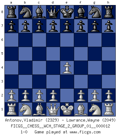 Last move : 1-0 2014 April 18 8:3:57 [Event "FICGS__CHESS__WCH_STAGE_2_GROUP_01__000012"] [Site "FICGS"] [Date "2014.03.18"] [Round "1"] [White "Antonov,Vladimir"] [Black "Lowrance,Wayne"] [Result "1-0"] [WhiteElo "2329"] [BlackElo "2049"] 1.e4 1-0 This chess game has been lost on time (started : 2014.03.18 23:39:57) King's pawn Opening Player White won this chess game. Follow this game move after move (download)Let the perfectionist play postal. (Yasser Seirawan) Wenn Capablanka heute auf der Schachbühne erscheinen würde, hätte er ein halbes Jahr gebraucht um sich die Schachtheorie anzueignen. Und dann hätte er alles und jeden besiegt. (Mikhail Moiseyevich Botvinik) La vida es como un juego de Ajedrez, cambiando con cada movimiento. (Proverbio Chino) Aidez vos pièces, elles vous aideront. (Paul Morphy) Even the best needles are not sharp at both ends. (Chinese proverb)