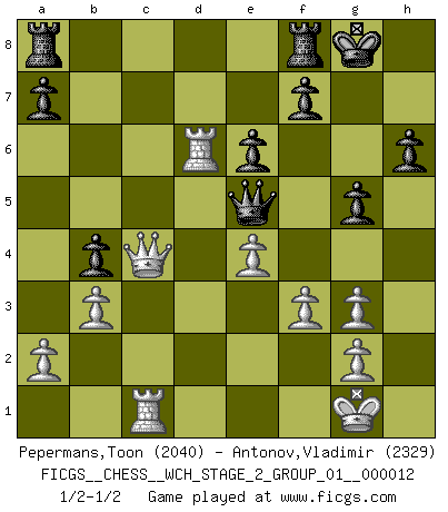 Last move : 1/2-1/2 2014 May 26 19:28:57 [Event "FICGS__CHESS__WCH_STAGE_2_GROUP_01__000012"] [Site "FICGS"] [Date "2014.03.18"] [Round "1"] [White "Pepermans,Toon"] [Black "Antonov,Vladimir"] [Result "1/2-1/2"] [WhiteElo "2040"] [BlackElo "2329"] 1.d4 d5 2.c4 c6 3.Nf3 Nf6 4.Nc3 e6 5.Bg5 h6 6.Bh4 dxc4 7.e4 g5 8.Bg3 b5 9.Be2 Bb7 10.Qc2 Nh5 11.Rd1 Nxg3 12.hxg3 Na6 13.b3 Nb4 14.Qb2 Nd3+ 15.Bxd3 cxd3 16.Rxd3 Qa5 17.Ne5 Bd6 18.O-O Bxe5 19.dxe5 b4 20.Ne2 c5 21.f3 Ba6 22.Rd6 O-O 23.Rc1 Bxe2 24.Qxe2 c4 25.Qxc4 Qxe5 1/2-1/2 QGD Slav : 4.Nc3 Kingside Castling by player White (move 18) Kingside Castling by player Black (move 22) This chess game ended in a draw. Follow this game move after move (download)Chess holds its master in its own bonds, shackling the mind and brain so that the inner freedom of the very strongest must suffer. (Albert Einstein) Ein Isolani verdüstert die Stimmung auf dem ganzen Schachbrett. (Savielly Grigorievitsch Tartakower) Una clavada es mas poderosa que una espada. (Fred Reinfeld) Le jeu d'échecs est comme rejeté hors du temps. (Antoine de Saint-Exupéry) Nothing is more important for teaching us to understand the concepts we have than constructing fictitious ones. (Ludwig Wittgenstein)