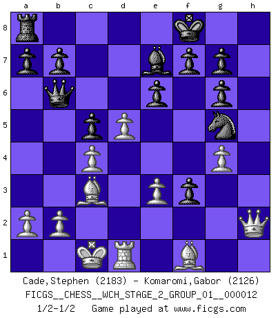 Last move : 1/2-1/2 2014 May 6 10:1:0 [Event "FICGS__CHESS__WCH_STAGE_2_GROUP_01__000012"] [Site "FICGS"] [Date "2014.03.18"] [Round "1"] [White "Cade,Stephen"] [Black "Komaromi,Gabor"] [Result "1/2-1/2"] [WhiteElo "2183"] [BlackElo "2126"] 1.d4 d5 2.c4 c6 3.Nf3 Nf6 4.e3 Bg4 5.Qb3 Qb6 6.Nc3 e6 7.Nh4 Be7 8.h3 Bh5 9.g4 Bg6 10.Nxg6 hxg6 11.g5 Ne4 12.Nxe4 dxe4 13.Qc2 Rh4 14.Rg1 c5 15.d5 Nd7 16.Bd2 Ne5 17.O-O-O Nf3 18.Rg4 Rxg4 19.hxg4 Nxg5 20.Bc3 Kf8 21.f4 exf3 22.Qh2 1/2-1/2 QGD Slav : 4.e3 Queenside Castling by player White (move 17) This chess game ended in a draw. Follow this game move after move (download)When the Chess game is over, the Pawn and the King go back to the same box. (Irish saying) Frage: Gibt es etwas was Sie mehr lieben als Autobahnen ohne Tempobegrenzungen? - Antwort: Deutsche Frauen ohne Tempobegrenzungen. (Loek van Wely) Puntos débiles o agujeros en la posición de tu oponente deben de ser ocupados por piezas, no Peones. (Siegbert Tarrasch) On peut tirer plus d'utilité d'une partie perdue que de 100 parties gagnées. (Capablanca) Mandala - that's it! 16x16 squares as multiple of the four and the eight because of the Four Noble Truths and the Noble Eightfold Path. (Heinz-Georg Lehnhoff about Big Chess)