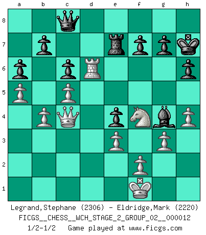 Last move : 1/2-1/2 2014 September 11 6:47:34 [Event "FICGS__CHESS__WCH_STAGE_2_GROUP_02__000012"] [Site "FICGS"] [Date "2014.03.18"] [Round "1"] [White "Legrand,Stephane"] [Black "Eldridge,Mark"] [Result "1/2-1/2"] [WhiteElo "2306"] [BlackElo "2220"] 1.d4 e6 2.c4 d5 3.Nc3 Nf6 4.cxd5 exd5 5.Bg5 Be7 6.e3 O-O 7.Bd3 c6 8.Qc2 Nbd7 9.Nf3 h6 10.Bh4 Re8 11.O-O Ne4 12.Bxe7 Qxe7 13.Rfe1 Ndf6 14.Ne5 Ng4 15.Nxg4 Bxg4 16.Bxe4 dxe4 17.Rec1 Rad8 18.h3 Bc8 19.Ne2 Rd5 20.Rab1 Rg5 21.Nf4 Qb4 22.a3 Qa5 23.Ra1 Bd7 24.b4 Qc7 25.a4 a6 26.Qb2 Qd6 27.Rc5 Rd8 28.Rac1 Re8 29.Qc3 Rd8 30.a5 Qe7 31.Qc2 Re8 32.Rd1 Qd8 33.g3 Be6 34.h4 Rxc5 35.dxc5 Bd7 36.Qd2 Re7 37.Qb2 Qf8 38.Rd6 Bg4 39.Qd4 Kh7 40.Kf1 Qg8 41.Qc4 Qc8 1/2-1/2 Queen's pawn Kingside Castling by player Black (move 6) Kingside Castling by player White (move 11) This chess game ended in a draw. Follow this game move after move (download)A thorough understanding of the typical mating continuations makes the most complicated sacrificial combinations leading up to them not only not difficult, but almost a matter of course. (Siegbert Tarrasch) Ich hatte Zahnschmerzen im ersten Spiel. In der zweiten Partie tat mir der Kopf weh. In der dritten war es eine Rheuma-Attacke und während der vierten fühlte ich mich nicht gut. Und in der fünften? Nun, man muss doch nicht jedes Spiel gewinnen, oder? (Savielly Grigorievitsch Tartakower) Aún el Rey más flojo huye despavorido ante la amenaza de un Jaque doble. (Aaron Nimzowitsch) Les Echecs représentent une sphère d'idées créatrices basée sur la volonté des deux protagonistes. (Smyslov) History is a gallery of pictures in which there are few originals and many copies. (Alexis de Tocqueville)
