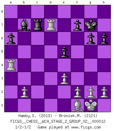 Last move : 1/2-1/2 2014 August 3 8:54:50 [Event "FICGS__CHESS__WCH_STAGE_2_GROUP_02__000012"] [Site "FICGS"] [Date "2014.03.18"] [Round "1"] [White "Hamby,Stephen"] [Black "Broniek,Mariusz Maciej"] [Result "1/2-1/2"] [WhiteElo "2013"] [BlackElo "2121"] 1.c4 e6 2.Nc3 d5 3.d4 Be7 4.Nf3 Nf6 5.Bg5 h6 6.Bh4 O-O 7.e3 b6 8.Rc1 Bb7 9.cxd5 Nxd5 10.Bxe7 Qxe7 11.Qa4 Nf6 12.Be2 a6 13.O-O b5 14.Qb3 Nbd7 15.Rfd1 Rac8 16.Ne5 c5 17.Nxd7 Nxd7 18.dxc5 Nxc5 19.Qb4 Rfe8 20.Bf1 Rc7 21.Ra1 g6 22.Rd4 e5 23.R4d1 Kg7 24.a4 Nxa4 25.Qxe7 R8xe7 26.Nxa4 bxa4 27.Rxa4 Red7 28.Rxd7 1/2-1/2 English Opening Kingside Castling by player Black (move 6) Kingside Castling by player White (move 13) This chess game ended in a draw. Follow this game move after move (download)I know people who have all the will in the world, but still can't play good Chess. (Bobby Fischer) Aljechin war kein Nazi. Er war ein Opportunist. Ein schrecklicher Mann. Er liebte Geld über alles und würde für Geld ein Jude, ein Katolik oder ein Protestant werden. (Miguel Najdorf) Una clavada es mas poderosa que una espada. (Fred Reinfeld) Votre prénom est 'Tactique', votre deuxième prénom est 'Tactique' et votre nom est 'Tactique'. (Ken Smith) Wisdom is the reward you get for a lifetime of listening when you'd have preferred to talk. (Doug Larson)
