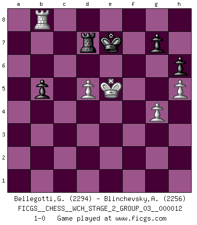 Last move : 1-0 2014 July 18 12:49:58 [Event "FICGS__CHESS__WCH_STAGE_2_GROUP_03__000012"] [Site "FICGS"] [Date "2014.03.18"] [Round "1"] [White "Bellegotti,Giorgio"] [Black "Blinchevsky,Alexander"] [Result "1-0"] [WhiteElo "2294"] [BlackElo "2256"] 1.e4 e5 2.Nf3 Nf6 3.Nxe5 d6 4.Nf3 Nxe4 5.d4 d5 6.Bd3 Nc6 7.O-O Be7 8.c4 Nb4 9.Be2 O-O 10.Nc3 Bf5 11.a3 Nxc3 12.bxc3 Nc6 13.Re1 Re8 14.cxd5 Qxd5 15.Bf4 Rac8 16.Bd3 Qd7 17.Rb1 Bxd3 18.Qxd3 b6 19.Re3 Bf6 20.Qb5 Rxe3 21.fxe3 Rd8 22.e4 Na5 23.Qxd7 Rxd7 24.Kf2 Be7 25.a4 f6 26.Ke2 Bd6 27.Bxd6 Rxd6 28.g4 Nb7 29.h4 Re6 30.Kd3 Nd6 31.Re1 h6 32.h5 a6 33.Nh4 Re8 34.Nf5 Nb7 35.c4 Kf7 36.Rf1 Kg8 37.Rb1 Na5 38.Ne3 Rc8 39.Nd5 Kf7 40.Re1 Rd8 41.Nxc7 Nxc4 42.Kxc4 Rc8 43.Kd3 Rxc7 44.Rb1 Rc6 45.d5 Rd6 46.Kd4 Ke8 47.e5 fxe5+ 48.Kxe5 Ke7 49.Rc1 Rd7 50.Rc8 b5 51.axb5 axb5 52.Rb8 1-0 Petrov : Classical attack Kingside Castling by player White (move 7) Kingside Castling by player Black (move 9) 10 pieces endgame at move 51 : White KRPPP , Black KRPPP WHITE : King + 1 Rook 3 Pawns BLACK : King + 1 Rook 3 Pawns Player White won this chess game. Follow this game move after move (download)The passed pawn is a criminal, who should be kept under lock and key. Mild measures, such as police surveillance, are not sufficient. (Nimzovitch) Ich hatte meine größten Erfolge, als ich 47 Jahre alt war. Kasparow war noch nicht mal 42 und hat das Schach schon im Stich gelassen. (Viktor Kortschnoi) Un Peón pasado es un criminal, quién debe ser mantenido bajo candado y llave. Leves medidas, tales como vigilancia policiaca, no son suficientes. (Aaron Nimzovich) Shah mat. Le roi est mort. Cri de fierté d'un joueur venant de terrasser son adversaire, courtoisement, sans effusion de sang. You must do what you feel is right... of course. (Obi-Wan Kenobi in Star Wars ep.4)