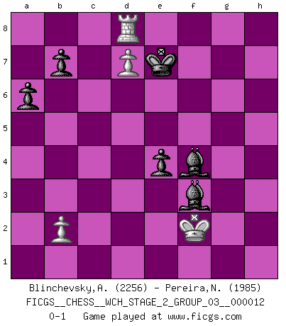 Last move : 0-1 2014 October 13 21:5:46 [Event "FICGS__CHESS__WCH_STAGE_2_GROUP_03__000012"] [Site "FICGS"] [Date "2014.03.18"] [Round "1"] [White "Blinchevsky,Alexander"] [Black "Pereira,Nilson"] [Result "0-1"] [WhiteElo "2256"] [BlackElo "1985"] 1.d4 Nf6 2.c4 e6 3.Nf3 d5 4.Nc3 c6 5.e3 Nbd7 6.Qc2 Bd6 7.g4 h6 8.Rg1 e5 9.cxd5 cxd5 10.Nb5 Bb8 11.g5 hxg5 12.Nxg5 e4 13.Bd2 Nb6 14.h3 a6 15.Ba5 Bf5 16.Nc3 Bh2 17.Rg2 Bc7 18.Qb3 Rc8 19.Rc1 Kf8 20.a4 Kg8 21.Bb4 Rh6 22.a5 Nc4 23.Bxc4 dxc4 24.Qxc4 Qd7 25.Na4 Qxa4 26.Qxf7+ Kh8 27.Bd2 Qd7 28.Qxd7 Bxd7 29.Nf7+ Kh7 30.Nxh6 gxh6 31.h4 Nd5 32.Rc5 Bc6 33.Rc4 Bd6 34.Rg4 Re8 35.Rc2 Bd7 36.Rg1 Nb4 37.Bxb4 Bxb4+ 38.Kf1 Bxa5 39.Rg3 Re7 40.Kg2 Bb4 41.Kf1 Bb5+ 42.Kg1 Bd6 43.Rg2 Bd7 44.h5 Be8 45.Rc8 Bxh5 46.Rd8 Bc7 47.Rf8 Rd7 48.Kf1 Bd6 49.Rc8 Bf3 50.Rg1 h5 51.R1g8 Be7 52.Kg1 Rd5 53.Rge8 Bd6 54.Red8 Kg6 55.Kf1 h4 56.Rc5 Bxc5 57.Rxd5 h3 58.Kg1 Be7 59.Kh2 Bh4 60.Kxh3 Bxf2 61.Rd6+ Kf5 62.Rd5+ Ke6 63.Rd8 Bxe3 64.Kg3 Bh5 65.d5+ Kf5 66.d6 Bf4+ 67.Kg2 Ke6 68.d7 Bf3+ 69.Kf2 Ke7 0-1 Queen's pawn game 10 pieces endgame at move 63 : White KRPP , Black KBBPPP WHITE : King + 1 Rook 2 Pawns BLACK : King + 2 Bishops 3 Pawns Player Black won this chess game. Follow this game move after move (download)Many have become Chess Masters, no one has become the Master of Chess. (Siegbert Tarrasch) Ein Remis kann durch Wiederholung von drei Zügen oder durch einen schlechte Zug erreicht werden. (Savielly Grigorievitsch Tartakower) Bendita sea la memoria de aquel que dio al mundo este juego inmortal. (A. G. Gardiner) Les échecs c'est le défi de l'alpiniste, toujours plus haut, prêt à tout pour monter à l'assaut du Roi ennemi. Les échecs, c'est de la musique en mouvement, un ballet majestueux pour les yeux. C'est de la poésie composée par les fantômes du passé qui au même titre que Rimbaud ou Verlaine méritent notre admiration. Les échecs, c'est de la peinture ou le moindre mouvement modifie le tableau pour en faire un Picasso ou un Van Gogh. Les échecs, c'est tout et rien, c'est la vie et la mort. Jjulie33 sur le forum de France-Echecs. Internal peace cannot coexist with external war. (Don Groves)