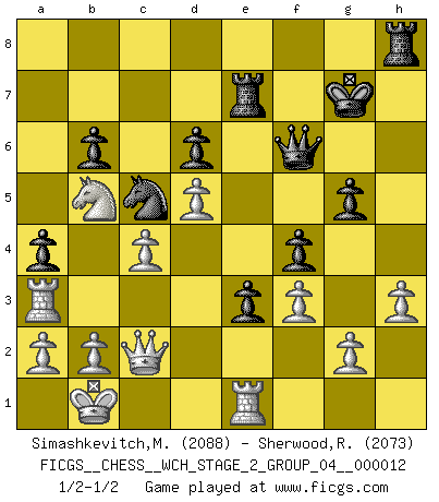 Last move : 1/2-1/2 2014 July 1 17:58:40 [Event "FICGS__CHESS__WCH_STAGE_2_GROUP_04__000012"] [Site "FICGS"] [Date "2014.03.18"] [Round "1"] [White "Simashkevitch,Mykola"] [Black "Sherwood,Russell"] [Result "1/2-1/2"] [WhiteElo "2088"] [BlackElo "2073"] 1.e4 c5 2.Nf3 d6 3.d4 cxd4 4.Nxd4 Nf6 5.Nc3 a6 6.Be3 e5 7.Nb3 Be6 8.f3 h5 9.Qd2 Nbd7 10.Nd5 Bxd5 11.exd5 g6 12.O-O-O Qc7 13.Kb1 Bg7 14.h3 Rc8 15.Rc1 h4 16.c4 b6 17.Bg5 Kf8 18.Qf2 a5 19.Rc3 a4 20.Nd2 Nc5 21.Be2 Nh5 22.Bxh4 Nf4 23.Bg3 f5 24.Rhc1 Kg8 25.Ra3 Re8 26.Ka1 g5 27.Qf1 Qf7 28.Nb1 e4 29.Nc3 e3 30.Be1 Qe7 31.Nb5 Bf6 32.Kb1 Kg7 33.Bc3 Kh6 34.Bxf6 Qxf6 35.R1c3 Nxe2 36.Qxe2 f4 37.Rc1 Re7 38.Re1 Rhe8 39.Qc2 Ra8 40.Ka1 Rae8 41.Rc3 Rf7 42.Qe2 Kg7 43.Rd1 Rfe7 44.Re1 Rf7 45.Qc2 Rfe7 46.Kb1 Rh8 47.Ra3 Kh6 48.Rc3 Kg7 49.Ra3 1/2-1/2 Sicilian : Najdorf, Byrne (English) attack Queenside Castling by player White (move 12) This chess game ended in a draw. Follow this game move after move (download)Even the laziest King flees wildly in the face of a double check ! (Aaron Nimzowitsch) Dein Körper muss in Topform sein. Dein Schach verfällt, wenn dein Körper verfällt. Der Körper kann nicht vom Geist getrennt werden. (Robert James Fischer) La belleza de un movimiento no se refleja solo en su apariencia, sino en el pensamiento detrás de él. (Siegbert Tarrasch) Soyez une menace à chaque fois que vous vous asseyez pour jouer. (Ken Smith) Chess is everything: art, science and sport. (Anatoly Karpov)