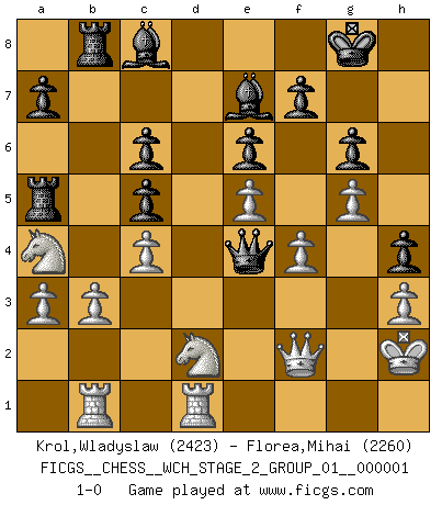 Last move : 1-0 2007 June 10 15:29:43 [Event "FICGS__CHESS__WCH_STAGE_2_GROUP_01__000001"] [Site "FICGS"] [Date "2007.02.15"] [Round "1"] [White "Krol,Wladyslaw"] [Black "Florea,Mihai"] [Result "1-0"] [WhiteElo "2423"] [BlackElo "2260"] 1.e4 c5 2.f4 Nc6 3.Nf3 d6 4.Bc4 e6 5.Nc3 Nf6 6.d3 Be7 7.a3 d5 8.Bb5 O-O 9.e5 Ng4 10.Bxc6 bxc6 11.O-O Nh6 12.Qe2 Nf5 13.b3 Qc7 14.Qf2 Rb8 15.Na4 Rb5 16.Bd2 h5 17.Rab1 Qb8 18.Be3 Nxe3 19.Qxe3 Ra5 20.c4 Ba6 21.Ng5 Qc7 22.Qe2 g6 23.Rfc1 Rb8 24.Nf3 Kg7 25.Kh1 Qd8 26.Nd2 Qd7 27.h3 Qd8 28.Nf3 Qc7 29.Qf2 Bc8 30.g4 Qd8 31.Kg2 h4 32.Kh2 Kg8 33.g5 dxc4 34.dxc4 Qd3 35.Rd1 Qe4 36.Nd2 1-0 Sicilian : Grand Prix attack Kingside Castling by player Black (move 8) Kingside Castling by player White (move 11) Player White won this chess game. Follow this game move after move (download)It is difficult to play against Einstein's theory --on his first loss to Fischer. (Mikhail Tal) Offensichtlich kennt Kasparow nichts anderes als Schach, und ich könnte 500 weitere Spieler dieser Sorte benennen. (Judith Polgar) Los asuntos humanos son como una partida de Ajedrez: solo aquellos que no lo toman seriamente, pueden ser llamados buenos jugadores. (Hung Tzu Ch'eng) Les Echecs, c'est l'art de la guerre sans les charniers, c'est la résurrection des morts tombés au champ d'honneur, l'espoir perpétuel, la suprématie de l'intelligence sur la force, la culture de l'esprit. (F. Szpiner) A good player is always lucky. (Capablanca)