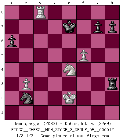 Last move : 1/2-1/2 2014 May 21 18:30:1 [Event "FICGS__CHESS__WCH_STAGE_2_GROUP_05__000012"] [Site "FICGS"] [Date "2014.03.18"] [Round "1"] [White "James,Angus"] [Black "Kuhne,Detlev"] [Result "1/2-1/2"] [WhiteElo "2083"] [BlackElo "2269"] 1.e4 c5 2.Nf3 d6 3.d4 cxd4 4.Nxd4 Nf6 5.Nc3 a6 6.Be3 e5 7.Nb3 Be6 8.h3 Be7 9.f4 Nc6 10.f5 Bxb3 11.axb3 Nb4 12.g3 d5 13.exd5 Qc7 14.d6 Bxd6 15.Nb5 Nxc2+ 16.Ke2 Qc6 17.Nxd6+ Ke7 18.Rc1 Nxe3 19.Rxc6 Nxd1 20.Nxb7 Rhb8 21.Rc7+ Kf8 22.Bg2 Nxb2 23.Nd6 e4 24.Rhc1 Rd8 25.Nxf7 Rd3 26.Ng5 Rxg3 27.Bxe4 Nxe4 28.Rc8+ Rxc8 29.Rxc8+ Ke7 30.Nxe4 Rxh3 1/2-1/2 Sicilian : Najdorf, Byrne (English) attack This chess game ended in a draw. Follow this game move after move (download)War is the child of passion, passion is the child of narcissism and narcissism is the child. (...) Another game ? (Thibault de Vassal) Ich habe die besten Aussichten, den ersten Preis zu gewinnen - denn jeder muss gegen Steinitz spielen, nur ich nicht! (Wilhelm Steinitz) Bendita sea la memoria de aquel que dio al mundo este juego inmortal. (A. G. Gardiner) L'attaque fait le spectacle, la défense gagne les matchs. (Dicton footballistique) No man has ever achieved immortality in his own life time. (Unknown)