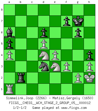 Last move : 1/2-1/2 2014 June 15 16:35:23 [Event "FICGS__CHESS__WCH_STAGE_2_GROUP_05__000012"] [Site "FICGS"] [Date "2014.03.18"] [Round "1"] [White "Simmelink,Joop"] [Black "Matisz,Gergely"] [Result "1/2-1/2"] [WhiteElo "2266"] [BlackElo "1650"] 1.e4 e5 2.Nf3 Nc6 3.Bb5 a6 4.Ba4 Nf6 5.O-O Be7 6.Re1 b5 7.Bb3 O-O 8.c3 Bb7 9.d4 d6 10.Nbd2 Re8 11.Nf1 g6 12.Bc2 exd4 13.cxd4 Nb4 14.Bb1 c5 15.d5 a5 16.a3 Na6 17.b3 Bf8 18.Bb2 c4 19.bxc4 bxc4 20.Bc2 Rc8 21.Rb1 Nc5 22.Ng3 Bg7 23.h3 Rb8 24.Bc3 Nfd7 25.Bxg7 Kxg7 26.Qd4+ Qf6 27.Qxc4 Ba6 28.Qd4 Qxd4 29.Nxd4 Ne5 30.f3 Nc4 31.a4 Na3 32.Rxb8 Rxb8 33.Ra1 Nxc2 34.Nxc2 Rb2 35.Nd4 Nd3 36.Nf1 h5 37.Ne3 h4 38.Kh2 1/2-1/2 Ruy Lopez : Closed, 7...O-O Kingside Castling by player White (move 5) Kingside Castling by player Black (move 7) This chess game ended in a draw. Follow this game move after move (download)I love all positions. Give me a difficult positional game, I will play it. But totally won positions, I cannot stand them. (Hein Donner) Es ist wirklich schade, dass so viele Schachspieler nicht auf ihr Äußeres achten! (Alexandra Kosteniuk) Si un gobernante no entiende al Ajedrez, ¿como puede governar él un reinado?. (El Rey Khusros II) D'abord les bases : Jouez et étudiez, puis étudiez et jouez, ensuite jouez et étudiez, puis étudiez et jouez. Deuxièmement : Donnez toujours le meilleur de vous-même ! (Ken Smith) The problem with troubleshooting is that trouble shoots back. (Anonymous)
