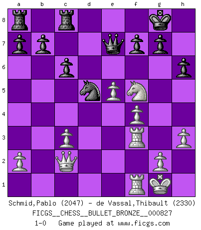 Last move : 1-0 2014 March 22 0:7:16 [Event "FICGS__CHESS__BULLET_BRONZE__000827"] [Site "FICGS"] [Date "2014.03.21"] [Round "1"] [White "Schmid,Pablo"] [Black "de Vassal,Thibault"] [Result "1-0"] [WhiteElo "2047"] [BlackElo "2330"] 1.d4 d5 2.c4 c6 3.Nf3 Nf6 4.Nc3 e6 5.Bg5 Nbd7 6.e3 Qa5 7.Nd2 Bb4 8.Qc2 O-O 9.Be2 e5 10.O-O exd4 11.Nb3 Qc7 12.Nxd4 dxc4 13.Bxc4 Bxc3 14.bxc3 Ne5 15.Be2 Qe7 16.Rad1 h6 17.Bxf6 Qxf6 18.f4 Ng4 19.Rf3 Qh4 20.h3 Nf6 21.Bd3 Re8 22.e4 Nh5 23.Rdf1 Nf6 24.e5 Nd5 25.Bf5 Qe7 26.Bxc8 Rexc8 27.Nf5 1-0 QGD Slav : 4.Nc3 Kingside Castling by player Black (move 8) Kingside Castling by player White (move 10) Player White won this chess game. Follow this game move after move (download)No one ever won a game by resigning. (Unknown) Ich hatte meine größten Erfolge, als ich 47 Jahre alt war. Kasparow war noch nicht mal 42 und hat das Schach schon im Stich gelassen. (Viktor Kortschnoi) Un Peón pasado es un criminal, quién debe ser mantenido bajo candado y llave. Leves medidas, tales como vigilancia policiaca, no son suficientes. (Aaron Nimzovich) Ce qui caractérise les parties de combat, c'est que si le défenseur a constamment de difficiles problèmes à résoudre, l'attaquant doit chercher sans relâche de nouvelles possibilités d'attaque. (Koblentz) The arrogant army will lose certainly the battle. (Chinese proverb)