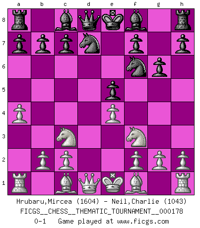 Last move : 0-1 2014 May 10 9:13:13 [Event "FICGS__CHESS__THEMATIC_TOURNAMENT__000178"] [Site "FICGS"] [Date "2014.03.25"] [Round "1"] [White "Hrubaru,Mircea"] [Black "Neil,Charlie"] [Result "0-1"] [WhiteElo "1604"] [BlackElo "1043"] 1.e4 e5 2.Nf3 Nf6 3.d4 d6 4.Nc3 Nbd7 5.a4 g6 6.dxe5 dxe5 0-1 This chess game has been lost on time (started : 2014.03.25 21:4:1) Petrov : Modern (Steinitz) attack Player Black won this chess game. Follow this game move after move (download)In Fischer's hands, a slight theoretical advantage is as good a being a Queen ahead. (Isaac Kashdan) Über die Verhaftung Bobby Fischers: Warum es die Bush-Administration für nötig befindet einen 61 Jahre alten Mann zu hetzten, der für niemanden ausser sich selbste eine Gefahr darstellt ist ein Rätsel. (Nigel Short) Los Peones son nacidos libres, y aún así, se encuentran por doquier encadenados. (Rick Kennedy) Même si l'adversaire joue le coup analysé précédemment, recommencez l'analyse en voyant la nouvelle position. Première règle de Blumenfeld However beautiful the strategy, you should occasionally look at the results. (Winston Churchill)