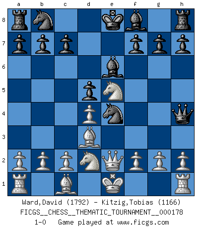 Last move : 1-0 2014 May 7 9:4:49 [Event "FICGS__CHESS__THEMATIC_TOURNAMENT__000178"] [Site "FICGS"] [Date "2014.03.25"] [Round "1"] [White "Ward,David"] [Black "Kitzig,Tobias"] [Result "1-0"] [WhiteElo "1792"] [BlackElo "1166"] 1.e4 e5 2.Nf3 Nf6 3.d4 Nxe4 4.Bd3 d5 5.Nxe5 Be6 6.Qe2 Qh4 7.Nd2 1-0 This chess game has been lost on time (started : 2014.03.25 21:4:1) Petrov : Modern attack, Symmetrical variation Player White won this chess game. Follow this game move after move (download)Chess holds its master in its own bonds, shackling the mind and brain so that the inner freedom of the very strongest must suffer. (Albert Einstein) Intelligenz läßt sich nicht am Weg, sondern nur am Ergebnis feststellen. (Garry Kasparov) El tablero es el mundo, las piezas es el fenomeno del universo, las reglas del juego son lo que llamamos leyes de la naturaleza y el jugador del lado opuesto, se encuentra oculto a nuestra vista. (Thomas Huxley) Les pièces de l'échiquier étaient impitoyables. Elles le retenaient, elles l'absorbaient. Il y avait de l'horreur en cela, mais aussi une harmonie unique. Car, qu'y a-t-il dans le monde, à part les échecs ? (V. Nabokov) Do you know these so called Volunteers don't even get paid! (Simpsons)