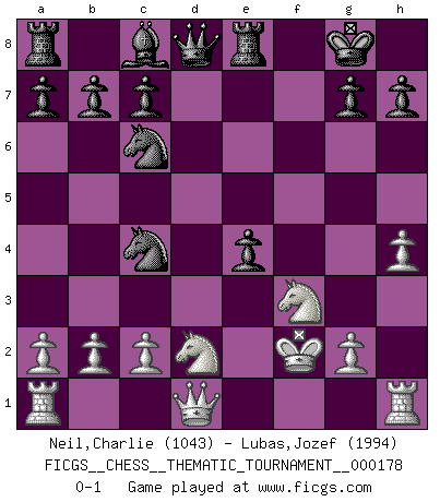 Last move : 0-1 2014 April 27 18:43:24 [Event "FICGS__CHESS__THEMATIC_TOURNAMENT__000178"] [Site "FICGS"] [Date "2014.03.25"] [Round "1"] [White "Neil,Charlie"] [Black "Lubas,Jozef"] [Result "0-1"] [WhiteElo "1043"] [BlackElo "1994"] 1.e4 e5 2.Nf3 Nf6 3.d4 Nxe4 4.dxe5 Bc5 5.Be3 Bxe3 6.fxe3 d5 7.exd6 Nc6 8.Nbd2 Nxd6 9.Bd3 O-O 10.h4 Re8 11.e4 f5 12.Kf2 fxe4 13.Bc4+ Nxc4 0-1 Petrov : Modern attack, Symmetrical variation Kingside Castling by player Black (move 9) Player Black won this chess game. Follow this game move after move (download)Chess is the art of analysis. (Mikhail Botvinnik) Sitze auf Deine Hände. (Siegbert Tarrasch) No hay precio que no valga la pena por la cabellera del Rey enemigo. (Koblentz) La tactique, c'est ce que vous faites quand il y a quelque chose à faire; la stratégie, c'est ce que vous faites quand il n'y a rien à faire. (Savielli Tartacower) A shortcut is the longest distance between two points. (Don Groves)
