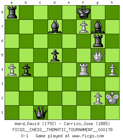 Last move : 0-1 2014 September 5 2:39:2 [Event "FICGS__CHESS__THEMATIC_TOURNAMENT__000178"] [Site "FICGS"] [Date "2014.03.25"] [Round "1"] [White "Ward,David"] [Black "Carrizo,Jose"] [Result "0-1"] [WhiteElo "1792"] [BlackElo "1885"] 1.e4 e5 2.Nf3 Nf6 3.d4 Nxe4 4.Bd3 d5 5.Nxe5 Nd7 6.Nxd7 Bxd7 7.O-O Bd6 8.c4 O-O 9.c5 Be7 10.Nc3 Nxc3 11.bxc3 c6 12.Qc2 g6 13.Bf4 b6 14.cxb6 axb6 15.a4 Bf6 16.Bd6 Re8 17.Bb4 Qc8 18.f4 c5 19.dxc5 bxc5 20.f5 cxb4 21.fxg6 Re6 22.gxf7+ Kf8 23.Bxh7 Qxc3 24.Qf5 Qc5+ 25.Kh1 Bxa1 26.Qg5 Bg7 27.h4 Rh6 28.Bg6 Qc4 29.Rf4 Qc1+ 30.Kh2 Rxg6 0-1 Petrov : Modern attack, Symmetrical variation Kingside Castling by player White (move 7) Kingside Castling by player Black (move 8) Player Black won this chess game. Follow this game move after move (download)You must take your opponent into a deep dark forest where 2+2=5, and the path leading out is only wide enough for one. (Mikhail Tal) Schach ist das Spiel, das die Verrückten gesund hält. (Albert Einstein) Las Aperturas te enseñan aperturas. ¡Los Finales te enseñan Ajedrez!. (Stephan Gerzadowicz) Le pion, dans sa simplicité, marche droit devant lui, mais lorsqu'il prend, il le fait obliquement? Ainsi l'homme, tant qu'il reste pauvre, marche dans la droiture et vit honnêtement, mais lorsqu'il recherche les honneurs, il flatte, se parjure et, par les voies obliques, cherche une position supérieure sur l'échiquier du monde. (Jean de Galles) Wisdom begins at the end. (Daniel Webster)