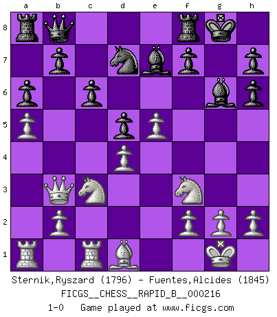 Last move : 1-0 2014 May 22 9:40:25 [Event "FICGS__CHESS__RAPID_B__000216"] [Site "FICGS"] [Date "2014.03.27"] [Round "1"] [White "Sternik,Ryszard"] [Black "Fuentes,Alcides"] [Result "1-0"] [WhiteElo "1796"] [BlackElo "1845"] 1.e4 c6 2.d4 d5 3.e5 Bf5 4.Be2 e6 5.Nf3 Nd7 6.O-O Nh6 7.a4 Be7 8.a5 a6 9.c4 Bg6 10.Qb3 Qc7 11.cxd5 exd5 12.Bxh6 gxh6 13.Rc1 Qb8 14.Nc3 O-O 15.Bd1 1-0 This chess game has been lost on time (started : 2014.03.27 20:42:35) Caro-Kann : Advance variation Kingside Castling by player White (move 6) Kingside Castling by player Black (move 14) Player White won this chess game. Follow this game move after move (download)If I win a tournament, I win it by myself. I do the playing. Nobody helps me. (Bobby Fischer) Die Jungen erwarten, dass Opa einfach umfällt. Dann aber kann Opa fünf Stunden lang Schach spielen und die jungen Gegner an die Wand drücken. (Viktor Kortschnoi) Los libros de Ajedrez deben de usarse igual como usamos los anteojos: para mejorar la vista, aunque algunos jugadores los quieren usar como si ellos les otorgaran la vision. (José Raúl Capablanca) A ce moment-là, je menaçais de comprendre la position ! (Clément L'Heureux) Programming can only do so much before it becomes too much. (Don Groves)