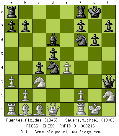 Last move : 0-1 2014 May 14 21:20:4 [Event "FICGS__CHESS__RAPID_B__000216"] [Site "FICGS"] [Date "2014.03.27"] [Round "1"] [White "Fuentes,Alcides"] [Black "Sayers,Michael"] [Result "0-1"] [WhiteElo "1845"] [BlackElo "1800"] 1.d4 Nf6 2.c4 c5 3.e3 e6 4.Nf3 d5 5.Nc3 Nc6 6.cxd5 exd5 7.Bd3 c4 8.Bb1 Be7 9.O-O O-O 10.h3 Be6 11.a3 Qc8 12.Qc2 g6 13.e4 Bxh3 14.gxh3 Qxh3 15.Nh2 Nxd4 16.Qd1 Bd6 0-1 This chess game has been lost on time (started : 2014.03.27 20:42:35) Benoni defense Kingside Castling by player White (move 9) Kingside Castling by player Black (move 9) Player Black won this chess game. Follow this game move after move (download)I give 98 percent of my mental energy to Chess. Others give only 2 percent. (Bobby Fischer) Gegen einen Schachcomputer zu verlieren ist wie Löcher in den Strümpfen zuhaben. Es ist nicht peinlich, solange man der einzige ist der es weiß. (Anonymous) La partida mas dura de ganar es una partida ganada. (Emanuel Lasker) Les erreurs sont comme les malheurs, elles n'arrivent jamais seules. (Siegbert Tarrasch) If we knew what we were doing, we would not call it research. (Albert Einstein)