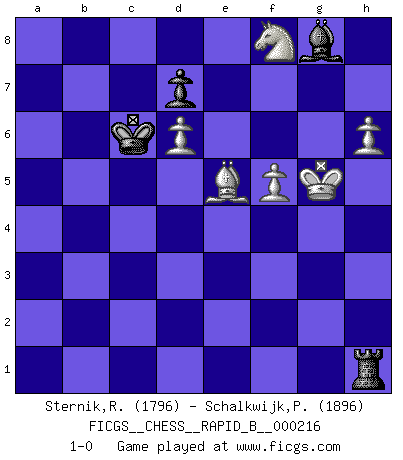 Last move : 1-0 2014 August 17 22:5:24 [Event "FICGS__CHESS__RAPID_B__000216"] [Site "FICGS"] [Date "2014.03.27"] [Round "1"] [White "Sternik,Ryszard"] [Black "Schalkwijk,Peter"] [Result "1-0"] [WhiteElo "1796"] [BlackElo "1896"] 1.e4 c5 2.Nf3 Nf6 3.e5 Nd5 4.Nc3 Nxc3 5.dxc3 Nc6 6.Bc4 e6 7.Bf4 h6 8.O-O b6 9.Qe2 Bb7 10.Rfd1 Qc7 11.Bg3 O-O-O 12.Rd2 g5 13.Rad1 Be7 14.h3 h5 15.a4 Rhg8 16.Ne1 g4 17.h4 Bf8 18.Bb5 Bh6 19.Rd6 Bf8 20.a5 bxa5 21.Bxc6 Bxc6 22.Qa6+ Bb7 23.Qxa7 c4 24.Ra1 Bc6 25.Qd4 Kb8 26.Qxc4 Bxd6 27.exd6 Qb6 28.b4 Rc8 29.Qf4 axb4 30.Rb1 Qa5 31.cxb4 Qb5 32.c4 Qf5 33.Qc1 Bb7 34.c5 Rc6 35.Qb2 f6 36.Ra1 Qe4 37.Qxf6 Qxb4 38.Nd3 Qb5 39.Qe7 Kc8 40.Qh7 Rd8 41.Rc1 Ra6 42.Ne5 Qb2 43.Rb1 Ra1 44.Rxa1 Qxa1+ 45.Kh2 Bd5 46.Ng6 Kb7 47.Qxh5 Qf1 48.Nf4 Be4 49.Qxg4 Ra8 50.Qe2 Qxe2 51.Nxe2 Kc6 52.f3 Bh7 53.Be5 Kxc5 54.h5 Kc4 55.Ng1 Kd5 56.f4 Rg8 57.Nf3 Be4 58.Nh4 Rc8 59.Kh3 Rc1 60.h6 Rh1+ 61.Kg4 Bh7 62.Kg5 Be4 63.g4 Bh7 64.Ng6 Kc6 65.f5 exf5 66.Nf8 Bg8 67.gxf5 1-0 Sicilian : Nimzovich-Rubinstein variation Kingside Castling by player White (move 8) Queenside Castling by player Black (move 11) 10 pieces endgame at move 67 : White KBNPPP , Black KRBP WHITE : King + 1 Bishop 1 Knight 3 Pawns BLACK : King + 1 Rook 1 Bishop 1 Pawn Player White won this chess game. Follow this game move after move (download)I like to say that Bobby Fischer was the greatest player ever. But what made Fischer a genius was his ability to blend an American freshness and pragmatism with Russian ideas about strategy. (Bruce Pandolfini) Kasparov ist eine Art Monster mit hundert Augen, denen auch nicht das Geringste entgeht. (Tony Miles) Botvinnik trataba de restarle el misterio al Ajedrez, siempre relacionandolo a situaciones de la vida ordinaria. El gustaba de llamar al Ajedrez un típico problema inexacto similar a aquellos de los cuales la gente siempre tiene que enfrentarse en la vida cotidiana. (Garry Kasparov) Des idées, des idées, j'en ai cent, j'en ai mille. Des bonnes, des mauvaises, applicables, irréalisables... Il suffit de faire le tri ! (Roos) The right perception of any matter and a misunderstanding of the same matter do not wholly exclude each other. (Kafka's the trial)