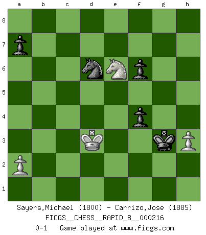 Last move : 0-1 2014 May 15 18:1:19 [Event "FICGS__CHESS__RAPID_B__000216"] [Site "FICGS"] [Date "2014.03.27"] [Round "1"] [White "Sayers,Michael"] [Black "Carrizo,Jose"] [Result "0-1"] [WhiteElo "1800"] [BlackElo "1885"] 1.e4 e5 2.f4 Bc5 3.Nf3 d6 4.c3 Bb6 5.d4 exd4 6.cxd4 Bg4 7.Be3 Nf6 8.h3 Bxf3 9.gxf3 O-O 10.Rg1 c5 11.dxc5 Bxc5 12.Bxc5 dxc5 13.Qxd8 Rxd8 14.Nc3 Nc6 15.Bc4 Rd4 16.b3 Nb4 17.Ne2 Nc2+ 18.Kf2 Rd2 19.Rad1 Rad8 20.Bd5 Rxd1 21.Rxd1 Nxd5 22.Nc3 Nce3 23.Rd2 Kf8 24.exd5 Nf5 25.Ne4 b6 26.d6 Ke8 27.Rd5 g6 28.Nf6+ Kf8 29.Nxh7+ Kg7 30.Ng5 Rxd6 31.Rxd6 Nxd6 32.Ke2 Kh6 33.Ke3 Kh5 34.Ke2 Kh4 35.Kf2 b5 36.Nh7 c4 37.bxc4 bxc4 38.Ng5 c3 39.Ke2 Kg3 40.f5 gxf5 41.Kd3 f4 42.Kxc3 f6 43.Ne6 Kxf3 44.Kd3 Kg3 0-1 KGD : Classical, 4.c3 Kingside Castling by player Black (move 9) 10 pieces endgame at move 42 : White KNPPP , Black KNPPP WHITE : King + 1 Knight 3 Pawns BLACK : King + 1 Knight 3 Pawns 9 pieces endgame at move 43 : White KNPP , Black KNPPP WHITE : King + 1 Knight 2 Pawns BLACK : King + 1 Knight 3 Pawns Player Black won this chess game. Follow this game move after move (download)Chess is thirty to forty percent psychology. You don't have this when you play a computer. I can't confuse it. (Judith Polgar) Du kannst im Schach nur gut werden, wenn du das Spiel liebst. (Robert James Fischer) El jugador blanco perdió porque fallo en recordar la coreccta continuación y tuvo que pensar por sí mismo las movidas. (Siegbert Tarrasch) Les échecs sont un jeu par leur forme, un art par leur essence et une science par sa difficulté d'acquisition. Ils peuvent vous procurer autant de plaisir qu'un bon livre ou une belle musique, mais vous n'aurez une réelle joie que si vous arrivez à bien jouer. (Tigran Petrosian) The age of a woman doesn't mean a thing. The best tunes are played on the oldest fiddles. (Ralph Waldo Emerson)