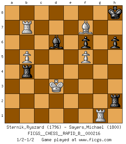 Last move : 1/2-1/2 2014 July 16 11:25:19 [Event "FICGS__CHESS__RAPID_B__000216"] [Site "FICGS"] [Date "2014.03.27"] [Round "1"] [White "Sternik,Ryszard"] [Black "Sayers,Michael"] [Result "1/2-1/2"] [WhiteElo "1796"] [BlackElo "1800"] 1.e4 e5 2.Nf3 Nf6 3.Nc3 Nc6 4.Bc4 Nxe4 5.O-O Be7 6.Nxe4 d5 7.Bd3 dxe4 8.Bxe4 Bg4 9.h3 Bxf3 10.Qxf3 Nd4 11.Qh5 c6 12.c3 Ne6 13.Qxe5 Bd6 14.Qh5 g6 15.Qd1 Qh4 16.d3 O-O 17.Qg4 Qxg4 18.hxg4 Rfe8 19.Be3 f6 20.g3 Nc5 21.Bxc5 Bxc5 22.Kg2 Re7 23.f4 Rf8 24.Rh1 Rd8 25.f5 gxf5 26.gxf5 Bd6 27.Kf3 Be5 28.d4 Bc7 29.Rae1 Rde8 30.g4 Kg7 31.b4 a5 32.a3 axb4 33.axb4 h6 34.Re2 Ra8 35.Ke3 Ra3 36.Kd3 Bd6 37.Rb2 Rd7 38.Re1 Be5 39.Kc2 Bg3 40.Rh1 Re7 41.Kd3 Rd7 42.Rd1 Kf8 43.Bf3 Be5 44.Kc2 Bf4 45.R2b1 Ra2+ 46.Kb3 Rh2 47.Kc4 Rc2 48.Rf1 Re7 49.Kb3 Rh2 50.Bxc6 Bd2 51.Bf3 Re3 52.Bxb7 Rxc3+ 53.Ka4 Rc4 54.Bf3 Rxd4 55.Rb2 Rh3 56.Ka5 Rd3 57.Bc6 Rd4 58.Kb5 Bc3 59.Rb3 Re3 60.Rg1 Re5+ 61.Ka4 Rc5 62.Rd1 Rxg4 63.Rd8+ Kg7 64.Bd5 Kh7 65.Bg8+ Kg7 66.Be6 Kh7 67.Rd3 Be1 68.Rd7+ Kh8 69.Rb7 Rc1 70.Bd5 Rd1 71.Bf7 R1d4 72.Ka3 Rh4 73.Rb1 Bd2 74.b5 Bb4+ 75.Ka2 Bd6 76.Rg1 Rh2+ 77.Kb3 Rb4+ 78.Kc3 Rh3+ 79.Kc2 Rh2+ 80.Kd3 Rh3+ 81.Kd2 Rh2+ 82.Kd3 1/2-1/2 Petrov Three knights game Kingside Castling by player White (move 5) Kingside Castling by player Black (move 16) This chess game ended in a draw. Follow this game move after move (download)Of Chess it has been said that life is not long enough for it, but that is the fault of life, not Chess. (William Ewart Napier) Im Schach gewinnt jeder. Hat man Freunde am Spiel - und das ist die Hauptsache - ist auch der Verlust einer Partie kein Unglück. (David Bronstein) En manos de Fischer's, una diminuta ventaja teórica es tan buena como tener una Reina de ventaja. (Isaac Kashdan) Votre prénom est 'Tactique', votre deuxième prénom est 'Tactique' et votre nom est 'Tactique'. (Ken Smith) That's absurd. I love it. (Gregory House, House M.D.)